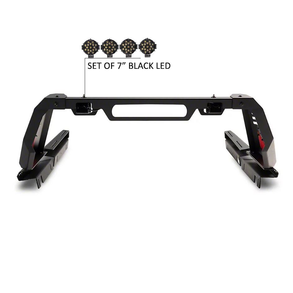 Black Horse Off Road Vigor Roll Bar Kit Black Steel Modular Incl. 2 pairs of 7.0"Dia. LED Lights w/ Black Trim Rings w/ Wiring Harness and Switch Doesn't work with Tonneau cover WITH ADJUSTABLE SQUARE LIGHT Patented