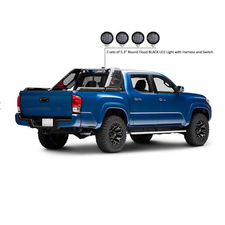 Black Horse Off Road Vigor Roll Bar Kit Black Steel Modular 2nd Box contains VI06 : 51lb, 34x12x7 & 2 sets of 5.3" Dia. Black LED Flood Lights w/ Harness and Switch Doesn't work with Tonneau cover WITH ADJUSTABLE SQUARE LIGHT Patented