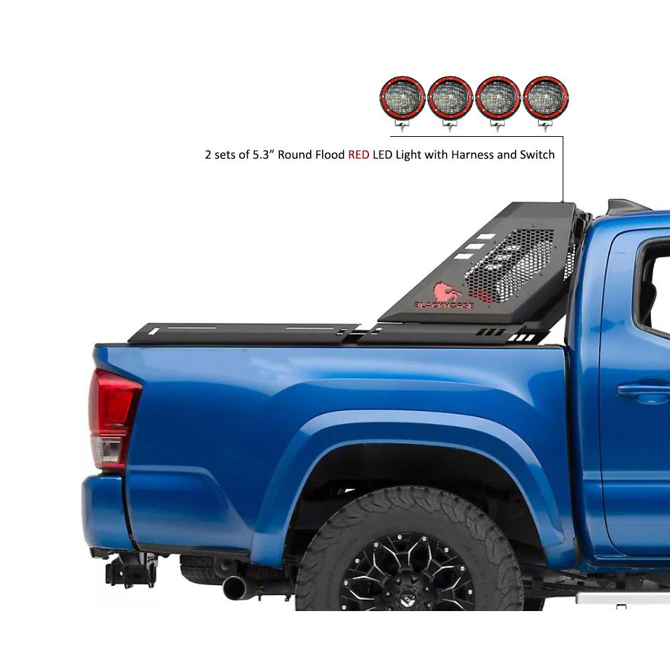 Black Horse Off Road Vigor Roll Bar Kit Black Steel Modular 2nd Box contains VI06 : 51lb, 34x12x7 & 2 sets of 5.3" Dia. Red LED Flood Lights w/ Harness and Switch Doesn't work with Tonneau cover WITH ADJUSTABLE SQUARE LIGHT Patented