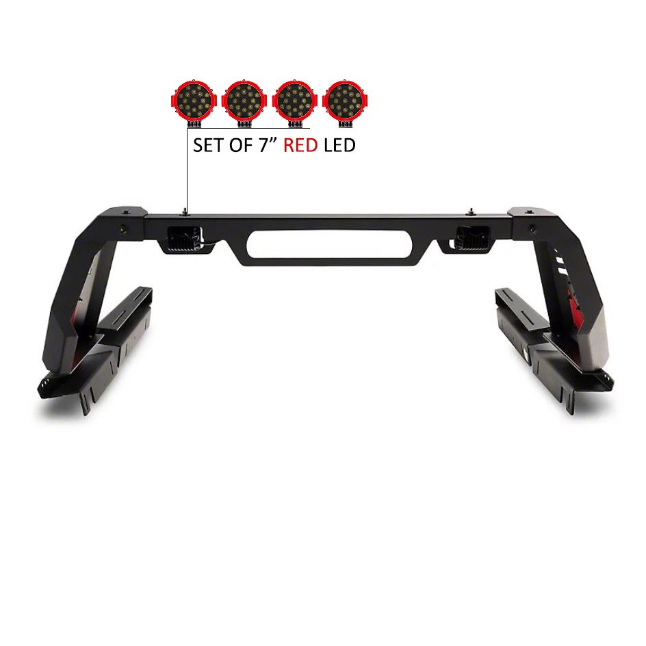 Black Horse Off Road Vigor Roll Bar Kit Black Steel Modular 2nd Box contains VI06 : 51lb, 34x12x7 Incl. 2 pairs of 7.0"Dia. LED Lights w/Red Trim Rings w/ Wiring Harness and Switch Doesn't work with Tonneau cover WITH ADJUSTABLE SQUARE LIGHT Patented