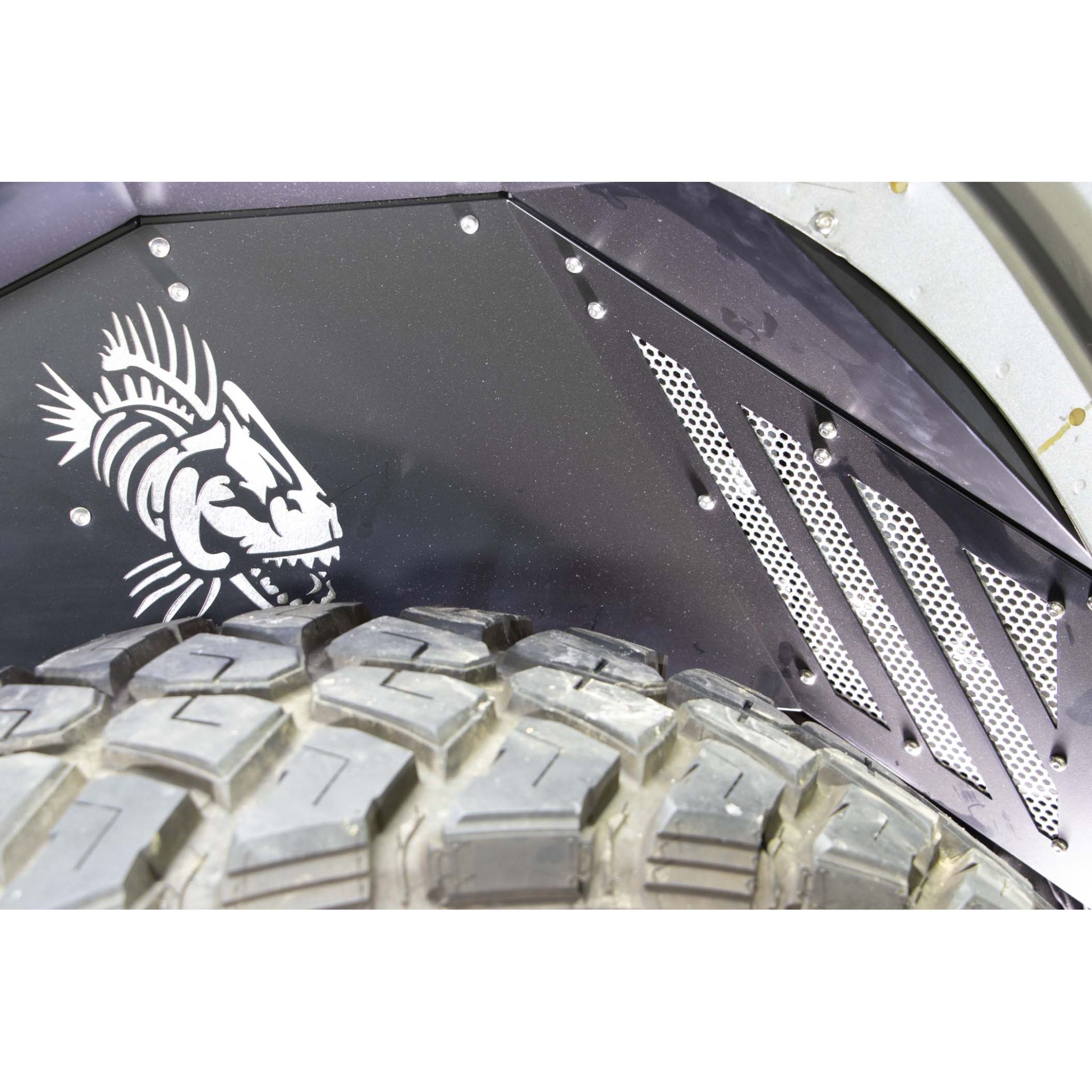 Fits 2018 to Current JL Wrangler, Rubicon and Unlimited 2 and 4-Door Models. Made from Black Powder Coated Aluminum. Fishbone logo laser cut on all 4 inners. Front and Rear Inner Fender JL Rear set will only fit JL Wrangler.