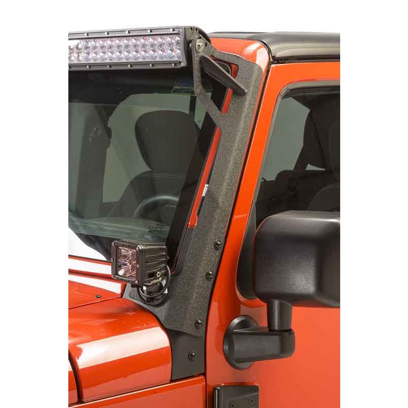 Fits 2007-2018 Jeep Wrangler JK and Jeep Wrangler Unlimited JKU, Black textured powder coat, designed for a 52" overall width light bar, includes pedestal mounts for 3×3 cube lights at the bottom of the windshield, Made from steel. Light bar sold separately..