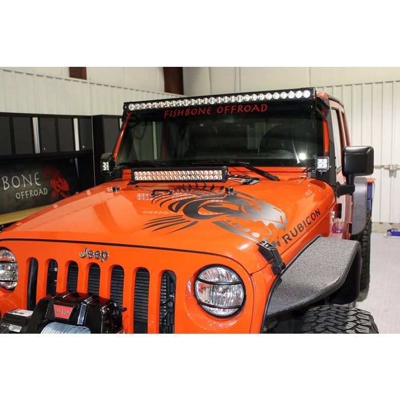 Elevate your 2007-2018 JK Wrangler's lighting with Fishbone Offroad's Hood Light Bar Bracket. Crafted for 2 and 4-door models, it supports 20" LED light bars. Durable steel with a black textured powder coat for rugged style. (Light bar sold separately)
