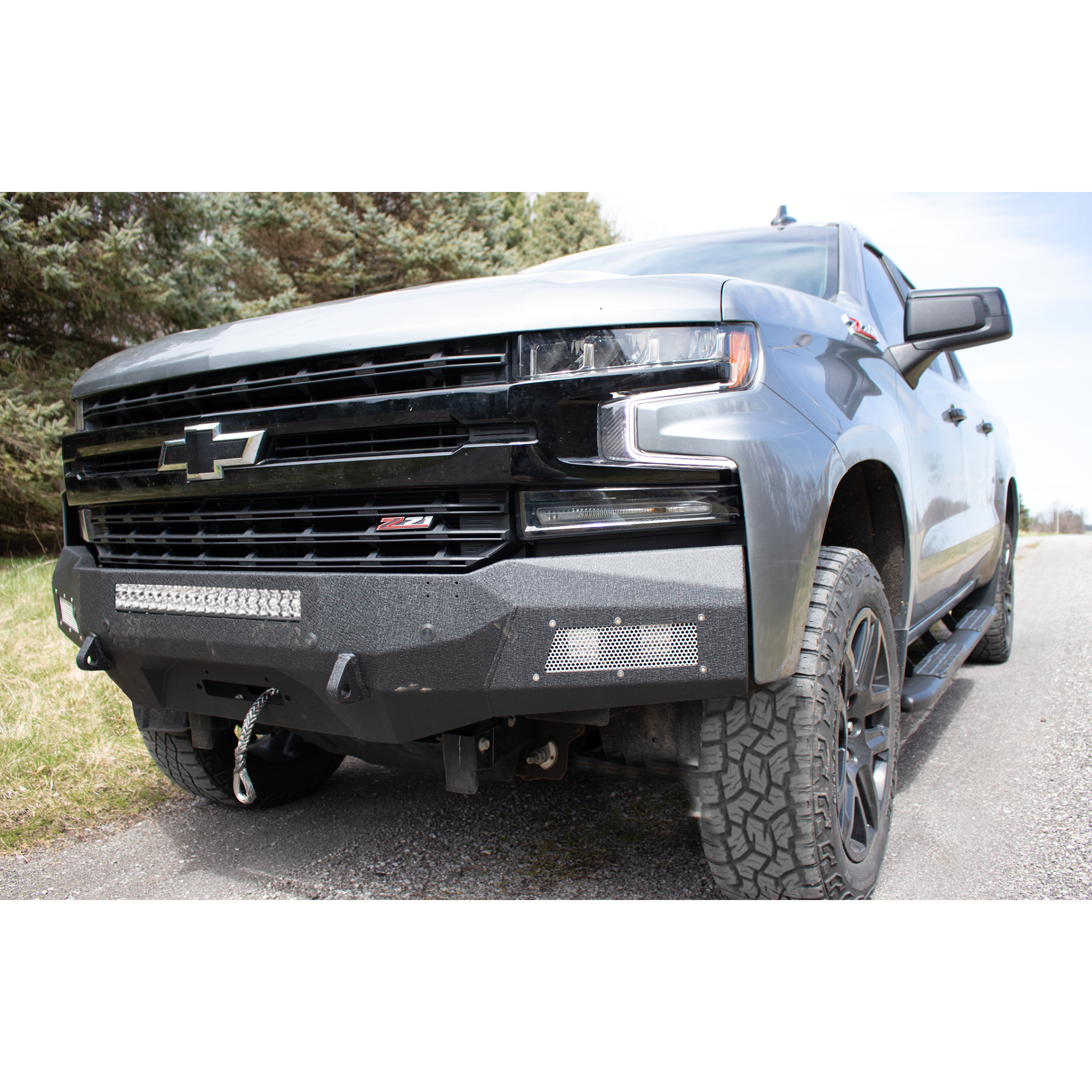 Fits 2019-2021 Chevy Silverado 1500 Does not fit Diesel Models Does not fit 2.7l Turbo Diesel Models LED Light Mounts Easy Bolt on Design Tight Body Fit 3/4 Inch D-Ring Mounts Improved Approach Angle & Added Tire Clearance (Fender Liner Trimming Required) 1/8-inch Steel with 1/4 inch reinforcements Black Textured2 Stage Powder Coat Winch Compatible (10 x 4.5-inch mounting pattern)