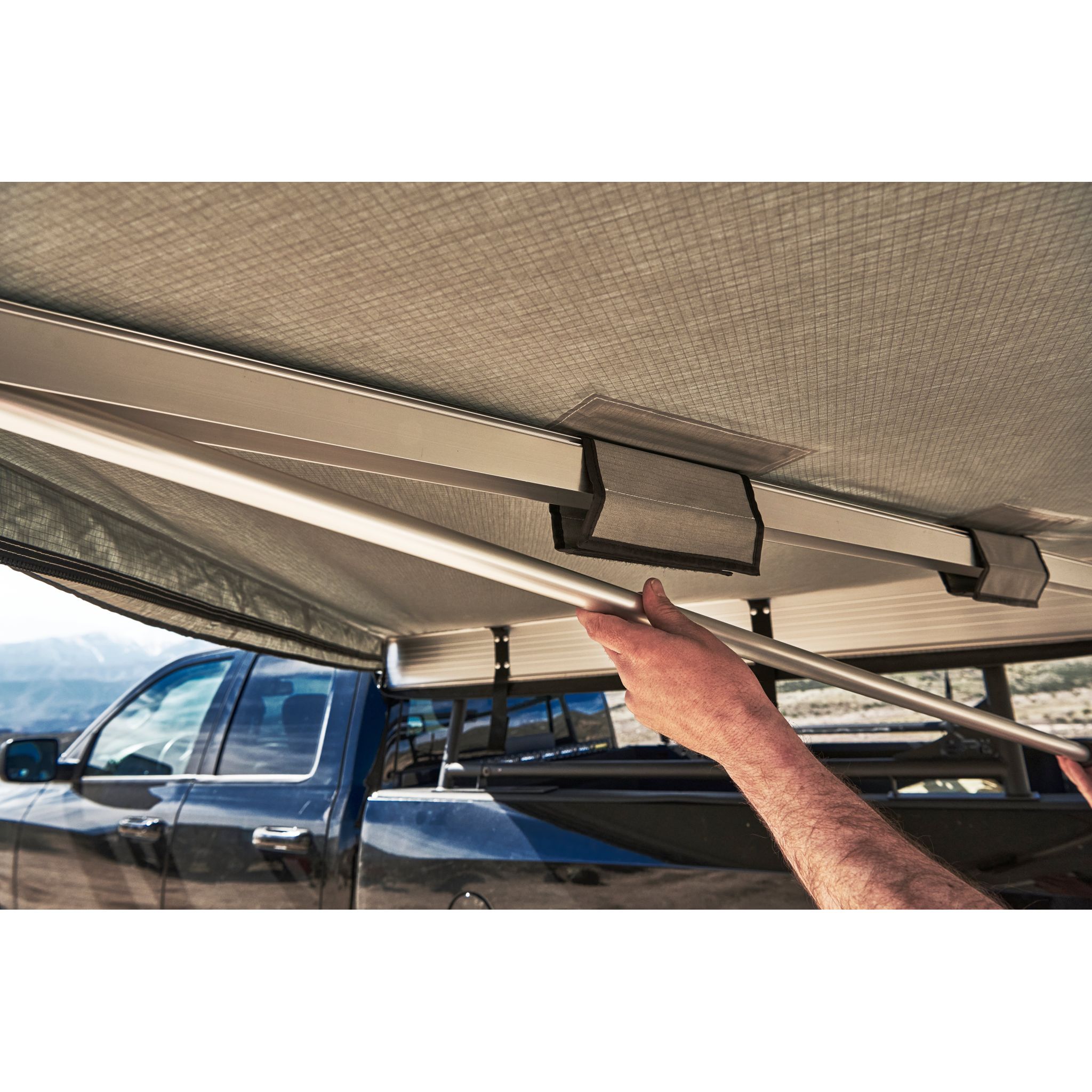 Introducing our versatile awning, designed to easily mount to virtually any roof rack or bed rack. Crafted from durable 280GSM poly cotton rip-stop fabric, it features a polyurethane coating for 2500mm waterproofing, ensuring reliable protection from the elements. This awning provides an impressive 80 square feet of covered space, perfect for shade, lounging, cooking, and more. The self-contained unit includes rugged, lightweight extruded aluminum with alloy hinges and telescopic legs with twist-lock fixtures for easy setup. The heavy-duty travel cover is made from sturdy, UV-resistant 1000G PVC-coated tarpaulin material with heavy-duty zippers. Designed for convenience, it allows for 1-person setup and teardown. Additionally, an optional wall kit is available to enhance your outdoor experience. Upgrade your adventures with this high-quality awning!