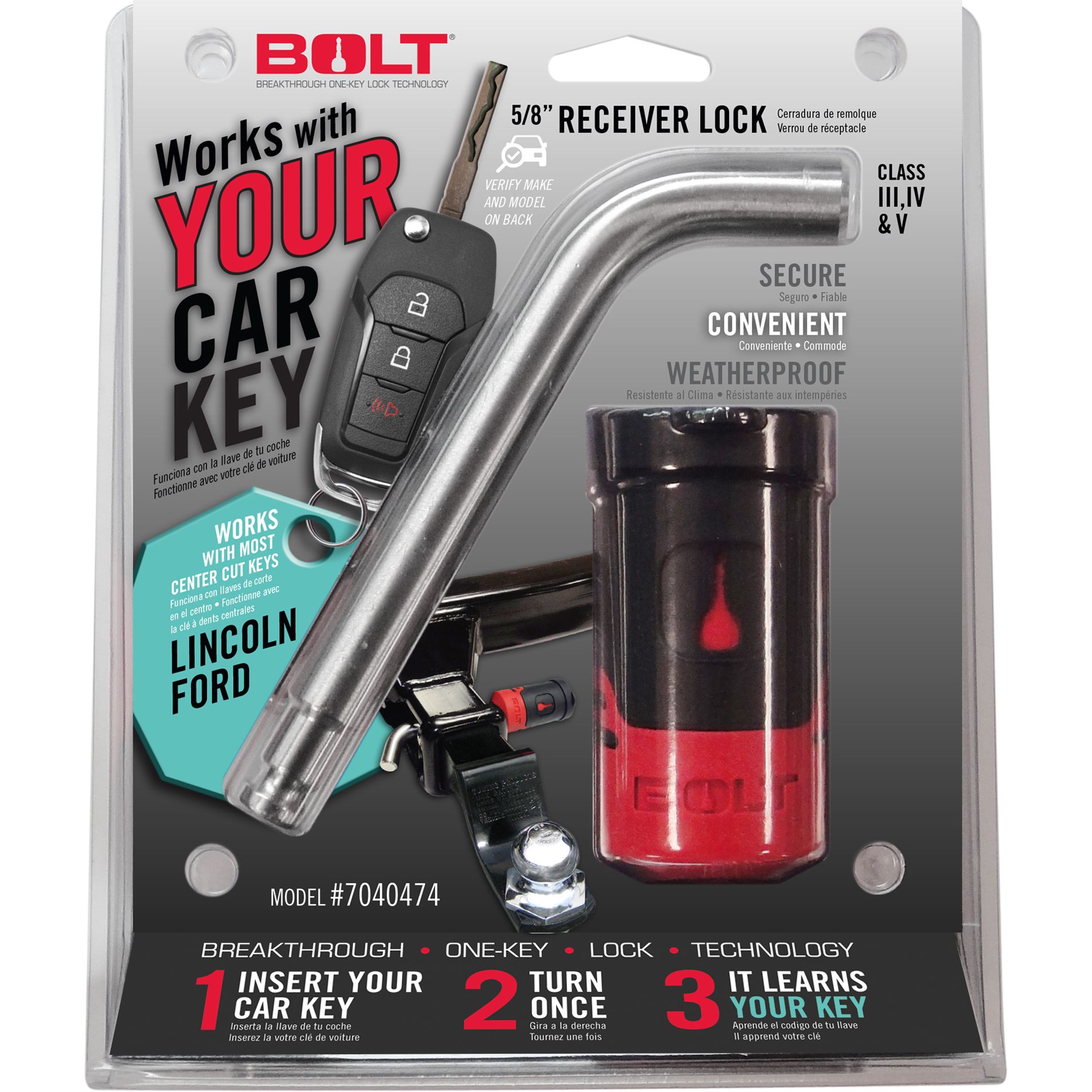 The only receiver lock that will open with YOUR FORD CENTER CUT key, BOLT Receiver Locks feature a solid zinc core, automotive grade cylinder with patented 6 plate-tumbler sidebar to prevent picking and bumping, a stainless steel lock shutter to keep out dirt and moisture, and a rugged jacket and cap.