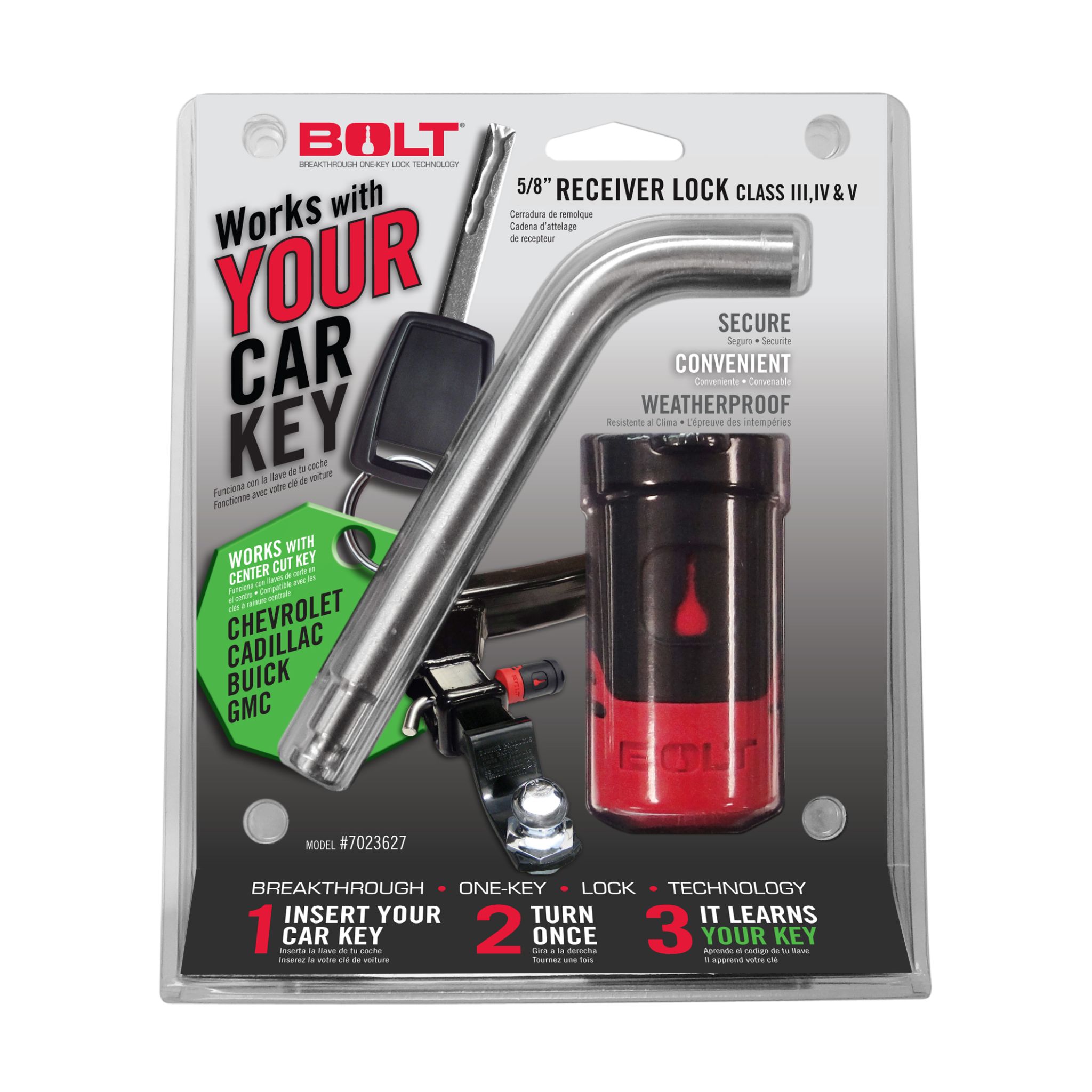 The BOLT 5/8" Receiver Lock lets you conveniently secure your hitch with your vehicle ignition key! Suitable for class 3-5 towing applications and fits both 2 and 2.5" receivers. Works with center cut Chevy, GMC, Buick and Cadillac Keys.