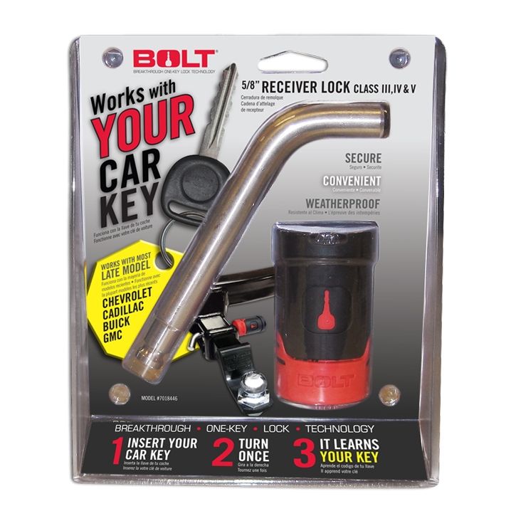 The BOLT 5/8" Receiver Lock lets you conveniently secure your hitch with your vehicle ignition key! Suitable for class 3-5 towing applications and fits both 2 and 2.5" receivers. Works with late model Chevy, GMC, Buick and Cadillac Keys.