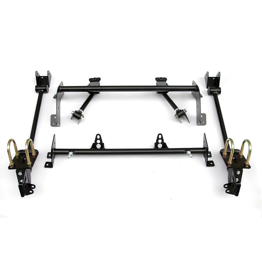 Bolt-On 4-Link for 1968-1970 Mopar B-Body. Includes R-Joints, adjustable upper bars, fixed lower bars, bolt-on cradle, axle brackets and hardware. Powder coated black. For use with Shockwaves or Coil-Overs, sold separately.