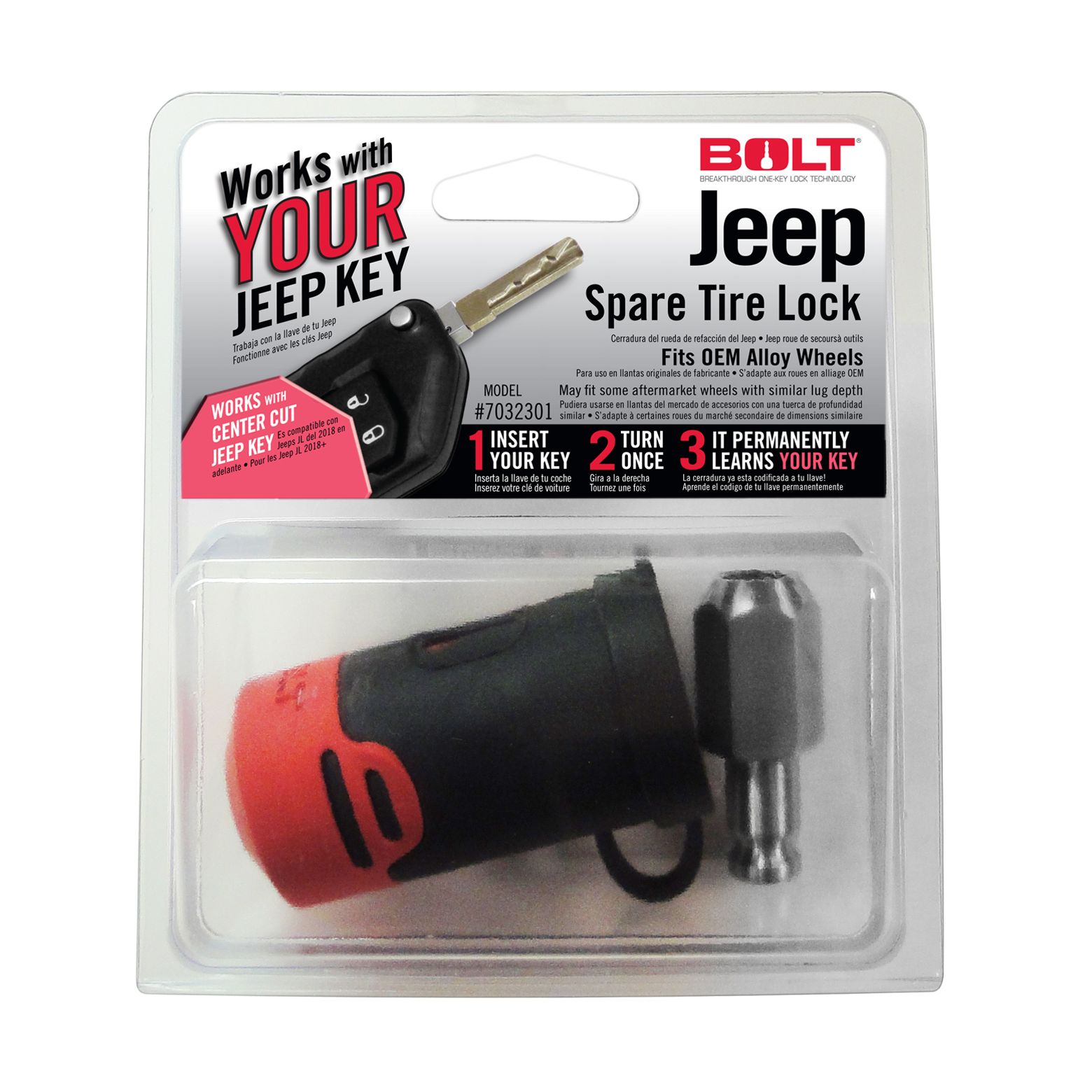 The only spare tire lock that will open with YOUR Jeep Wrangler JL key, BOLT spare tire locks feature solid zinc core, automotive grade cylinder with patented 6 plate-tumbler sidebar to prevent picking and bumping, a stainless steel lock shutter to keep out dirt and moisture, auto-return spring automatically locks when key is removed, stainless steel threaded lug nut and rugged jacket that protects your Gear. They offer a Limited Lifetime Warranty.