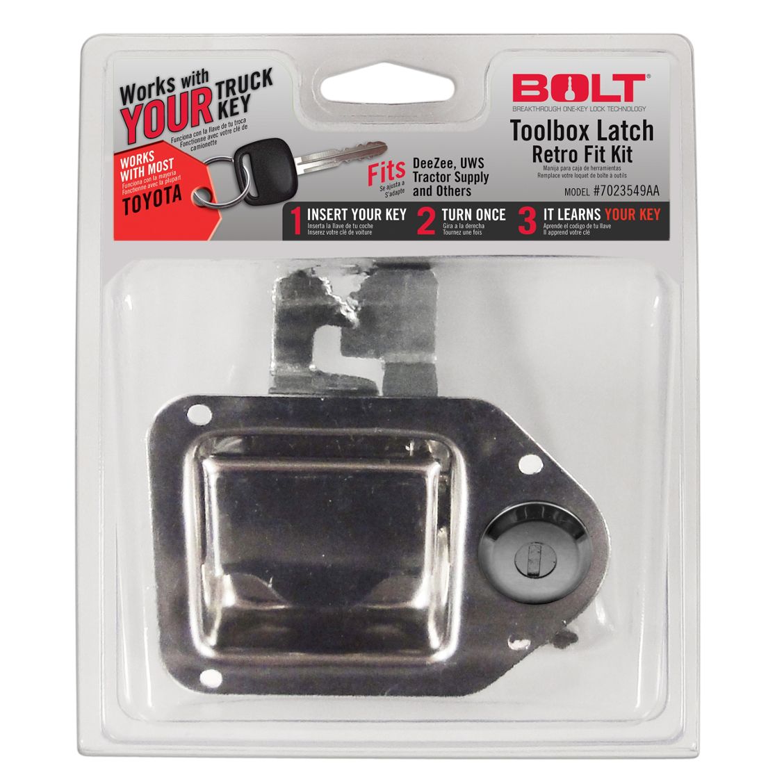 The BOLT Toolbox Latch Retrofit Kit allows you to easily replace the existing toolbox latch with an OEM stainless steel latch and the BOLT Lock that works with your truck key. Works with Toyota Keys.