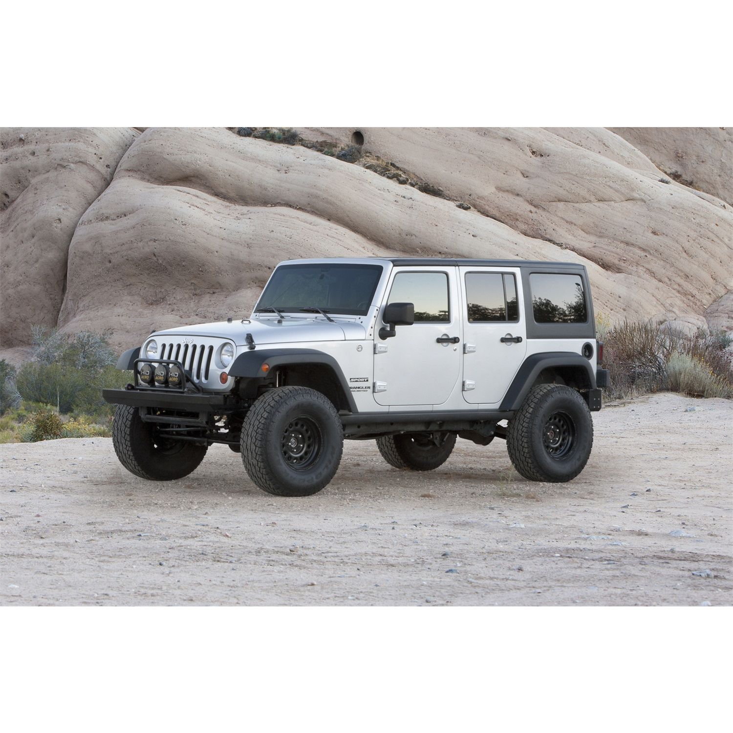 Fabtech offers a 3 Budget System for Jeep JKs that includes four American made Coil Springs that have been designed to clear 35 tall tires. The Coil Springs are specific to 2 or 4 door models and undergo a preset manufacturing process to insure a consistent ride height. System also includes front and rear Shocks, front Sway Bar Links, front Bump Stops, rear Bump Stop extensions, Rear Trac Bar bracket rear Brake Hose extension, Emergency Brake cable brackets all in one box. This System will increase offroad capabilities and provide a good highway ride.