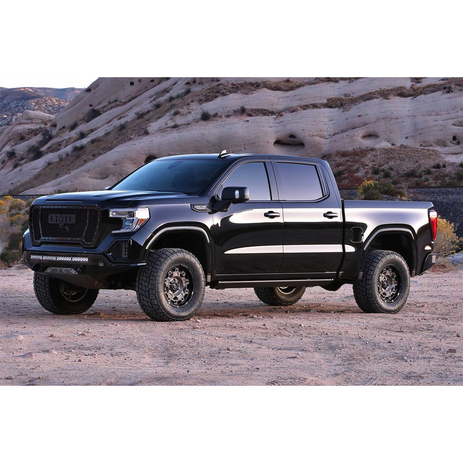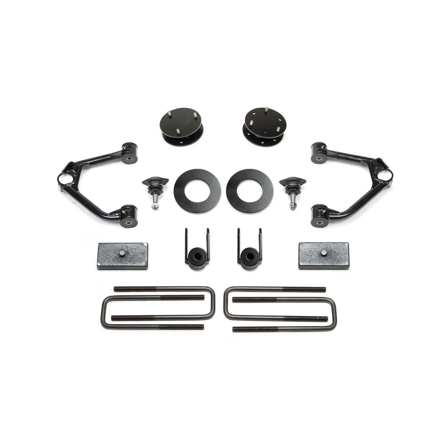 Fabtech's Upper Control Arm system provides a 3.5 in. increased ride height over stock without creating suspension bind at full droop. Lift is accomplished with steel spacers that utilizes the factory Adaptive Ride Control coilovers. The replacement Upper Control Arms address the geometry of the front suspension with the new ride height for proper alignablity. Heavy duty ball joints allow for extended travel to eliminate binding. Rear lift comes from 1.5 in. blocks and u-bolts. Heavy duty rear shock extension brackets retain the factory Adaptive Ride Control shocks for an outstanding ride quality.