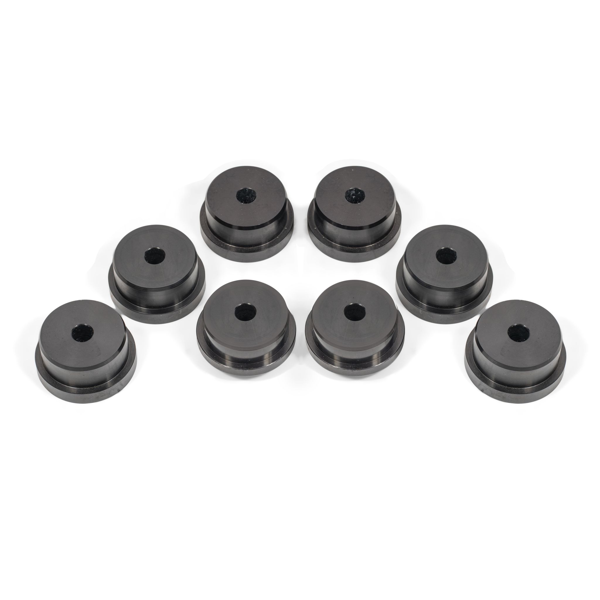 Eliminate rear cradle movement in your S550 or S650 Mustang with a Aluminum Rear Cradle Bushing Kit from BMR Suspension. The OE bushings are designed with air pockets and are made from soft rubber. These "voids, coupled with soft material produce excessive rear cradlel movement during normal and aggressive driving. These bushings are CNC-machined from Aluminum, which is known for its high stiffness, low friction and excellent dimensional stability. This material eliminates deflection with only moderate increases in NVH. Each bushing is machined to exact tolerances, which are designed by BMR. This allows for a perfect fit and increased performance for any driving style. The BMR Aluminum Rear Cradle Bushing Kit (BK048) greatly increases the rigidity and stability of the chassis to provide maximum control and consistency necessary for any form of competition or high performance street driving. Designed for max effort street performance, drag race, and handling applications, BMR Suspension BK048 Aluminum Cradle Bushings are the perfect wheelhop solution for any S550 Mustang where NVH is not a concern. BMRs Aluminum cradle bushings replace the entire OE rubber bushing, eliminating differential movement by replacing the soft rubber OE bushings with solid two-piece Aluminum bushings. These bushings remove all movement between the rear cradle and chassis, eliminating the deflection that occurs during acceleration, cornering, and braking. This reduces wheelhop and increases handling stability, while giving you a much-improved overall feel in any performance driving situation. BMR Suspensions BK048 Aluminum Rear Cradle Busing Kit is available in black. Installation time is about 3-4 hours and may vary depending on stock bushing removal technique. Proudly made in the U.S.A.!