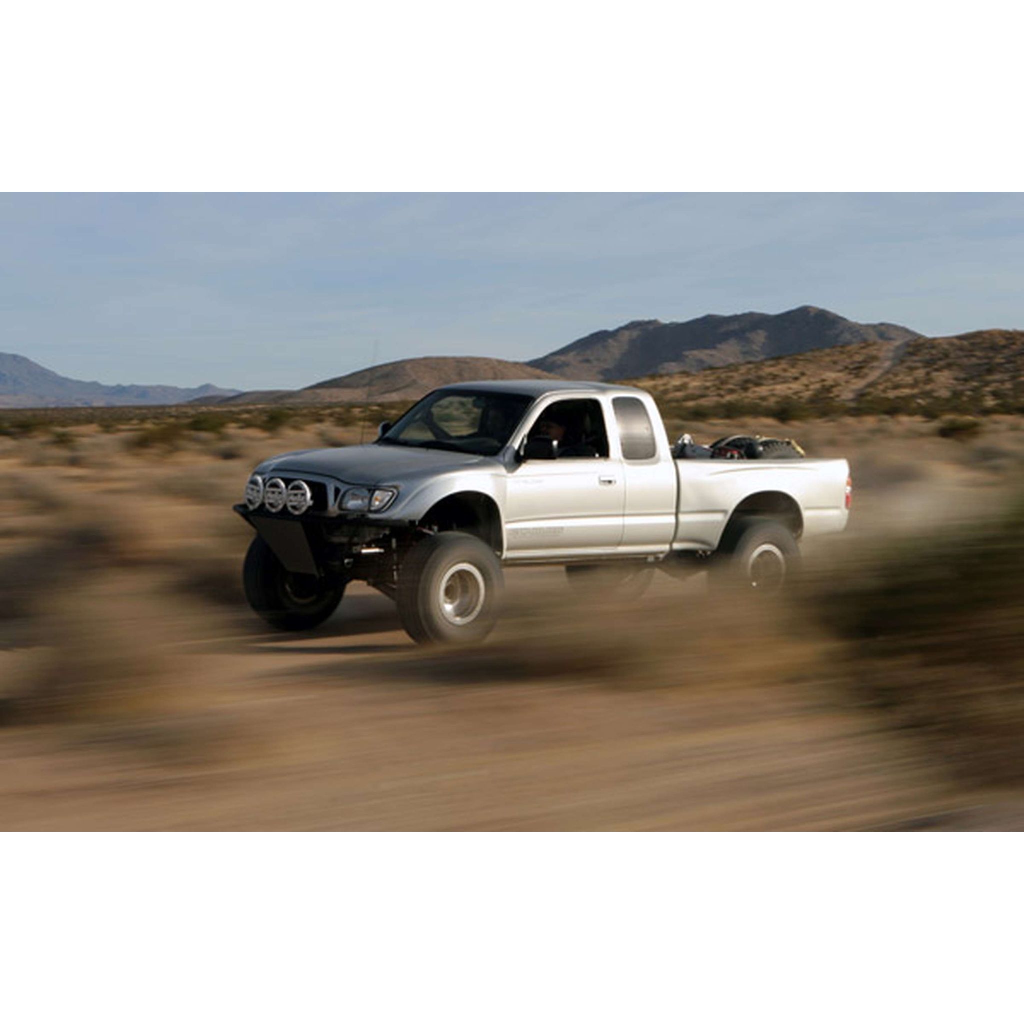 Our long travel kit takes your Tacoma to the next level. First to develop a L/T kit for the Tacoma platform years ago, this kit has been used and raced on throughout the world. Our kit increases wheel travel to 13” and widens the front trackwidth 3.5” per side. We’ve improved front end geometry for better handling and driving characteristics for both on and off-road use. This kit is great for tight and technical trails that require increased articulation and traction along with higher speed desert use needing bottoming control with much stronger components that won’t leave you stranded in the middle of nowhere. The chromoly upper arms use poly bushings at the frame pivots. This reduces flexing while under heavy loads and braking while allowing for reduced friction and zero binding. We combine this with an FK 1” uniball that adapts to the spindle with heat-treated stainless spacers for max wheel travel. The lower arms are a fabricated boxed design for added strength, more ground clearance and lighter weight. All Camburg lower arms use FK 1” uniballs at the inner pivots. Cheaper poly or delrin bushings have no business at these locations when something better is offered. The uniballs allow for zero binding when the suspension cycles up and down and has zero flex under braking, so your geometry and alignment is always consistent. With Toyota’s being aligned by their lower arm, a uniball setup allows for a bind free adjustment and you’re able to torque all the bolts without putting it into a bind. This better clamping force in the frame keeps the holes from ovaling out over time, a lesser chance of the bolts loosening or the alignment cams rotating. You have the ability to run a coilover with a bypass shock and a bump stop for the ultimate control for off-road use. We have Camburg spec. FOX or King 2.5 coilovers and bypass shocks that we’ve designed to yield maximum useable wheel travel and control with specific valving and tube layouts.