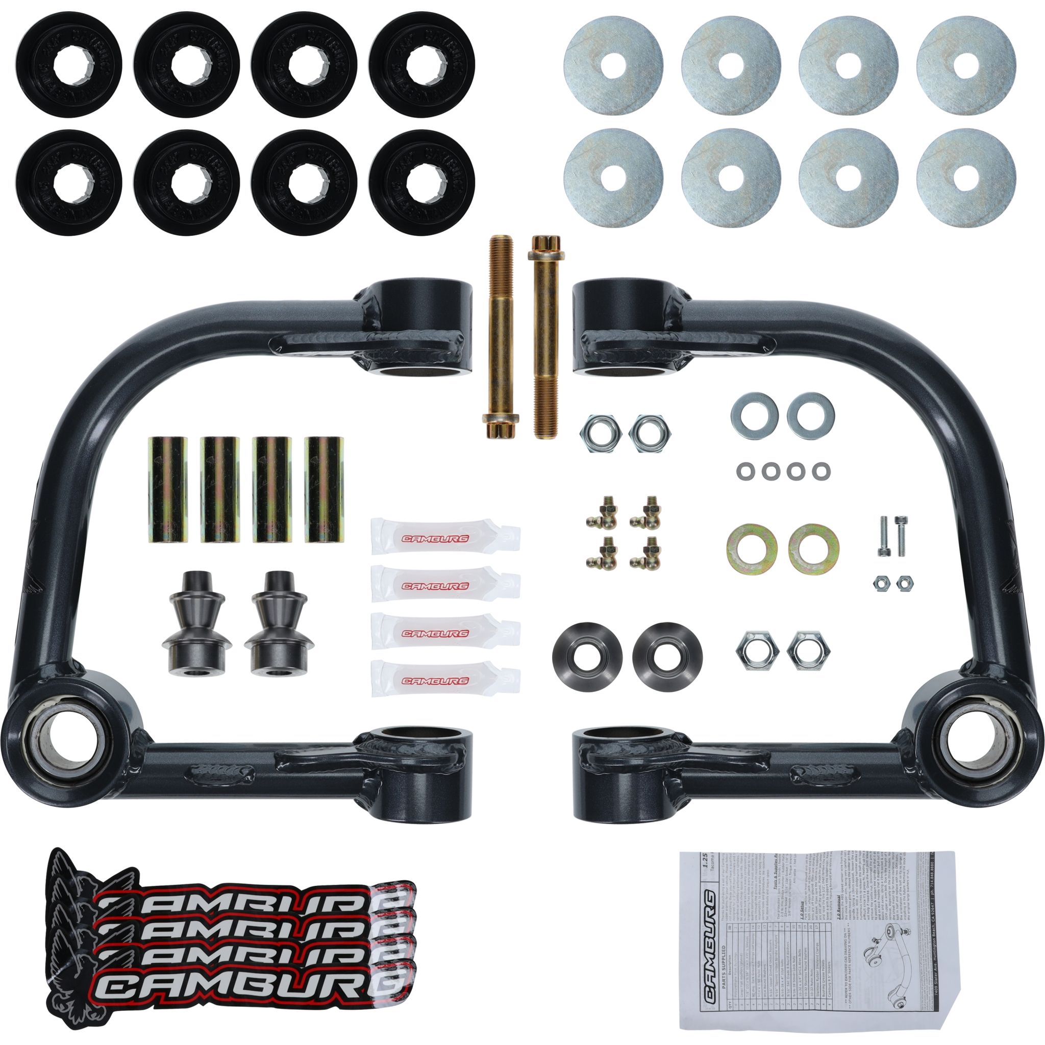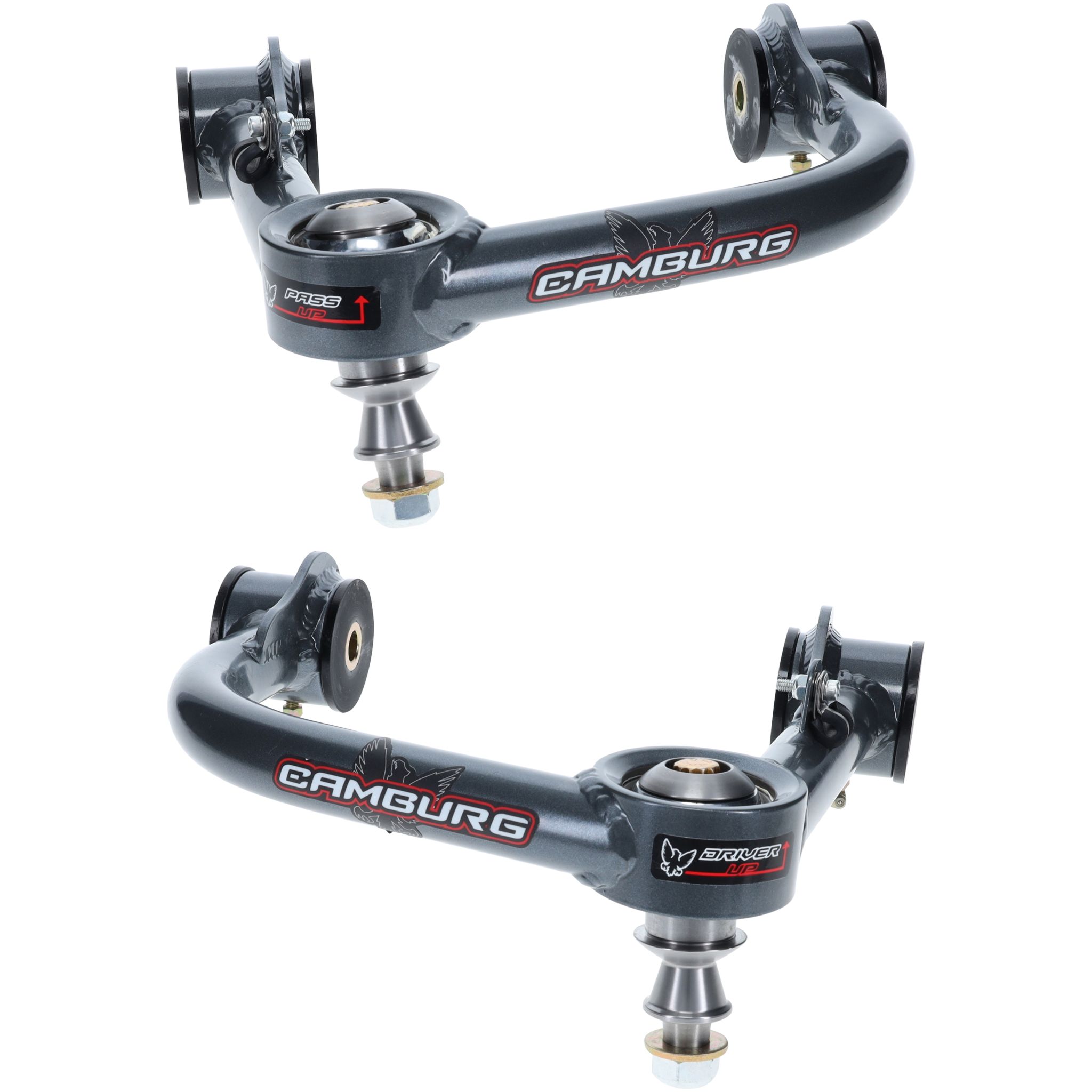 When lifting your truck, the stock upper arms become the limiting factor and hold back your suspensions performance. Our Camburg upper arms address these issues and more. Replacing the stock ball-joint with a larger 1.25 uni-ball bearing we’re able to gain wheel travel with a part that is considerably stronger and will last longer under extreme conditions. We build more caster and change the camber curve to correct geometry so the vehicle aligns correctly and improves driving characteristics and handling. Using the latest CAD/CAM engineering software we design these arms to the strictest standards using our FARO laser scan arm to model the OEM parts and frames. Manufactured in-house, we have the tubes CNC laser cut and bent, then are MIG welded in precision fixtures before sending out to be sandblasted and powder-coated. Our in-house CNC machine shop makes all the machined parts including the uniball mis-alignment spacers from heat-treated stainless steel. We pride ourselves in producing the best parts available under our own roof and control. Increases usable wheel travel Corrects camber and caster Eliminates weak factory ball-joints Thicker.156" wall round tubing Laser cut and CNC bent tubes MIG welded CAD/CAM engineered Polyurethane frame pivot bushings with grease-able zerk fittings FK 1.25" PTFE-lined uniballs pre-installed Steel gray powder-coating All necessary hardware included and ready to install Made in the USA Designed for 1-3" of lift Increases usable wheel travel Corrects camber and caster Eliminates weak factory ball-joints 1.25" FK uniballs.