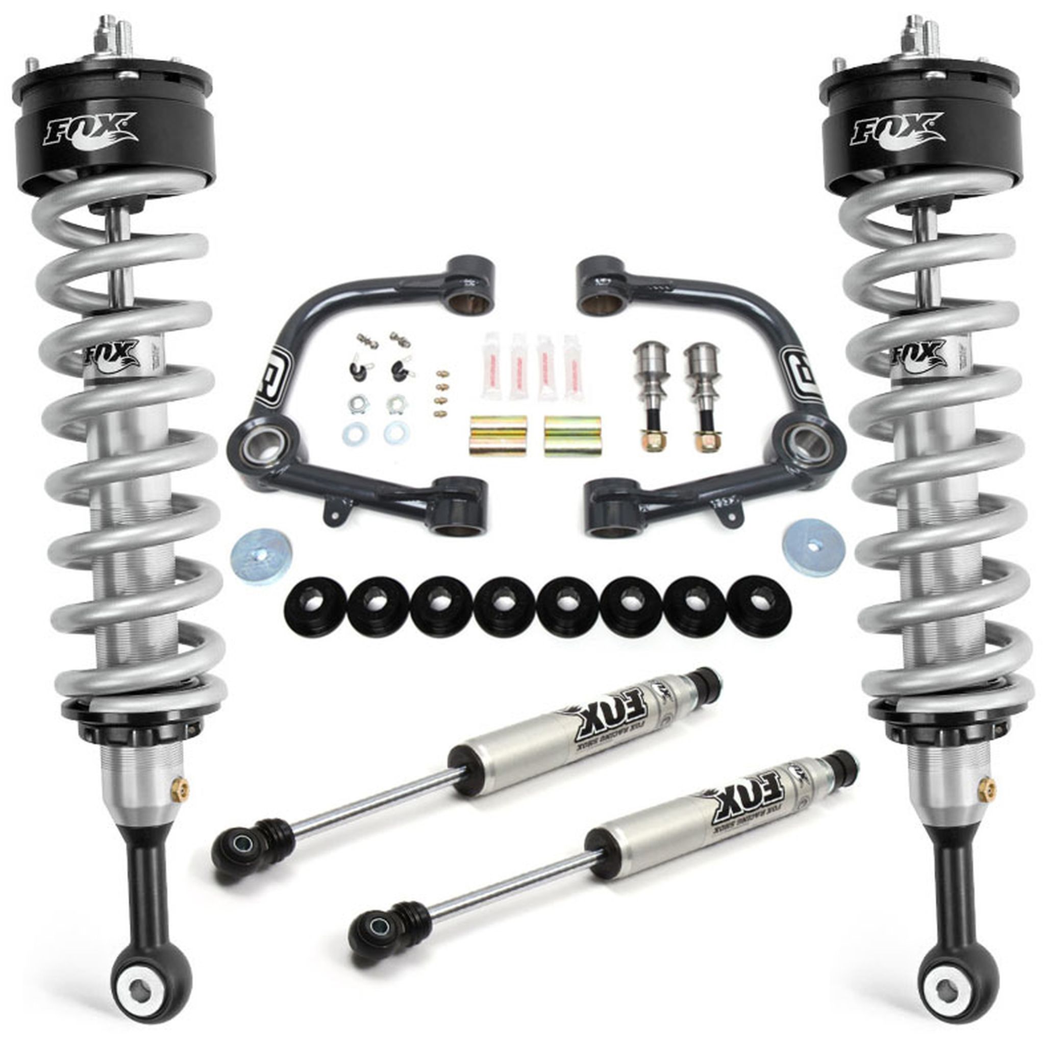 Our Camburg FOX 2.0 Trail Series kit is a suspension system for Toyota Tacoma. It includes FOX 2.0 Performance Series IFP Coilovers for 0-2 inches of lift and increased wheel travel. The shocks have a smooth-bore, clear coated, zinc plated, honed seamless alloy body, black anodized 6061-T6 billet aluminum components, and a 5/8" hard chrome plated heat treated alloy steel shaft. They also have an internal reservoir design to separate shock oil from high-pressure nitrogen. The kit also includes upper arms to address limitations of stock arms, increase wheel travel, and improve alignment and handling. In the rear, there are FOX 2.0 Performance Series shocks with a larger aluminum shock body for better off-road performance and a firmer ride.