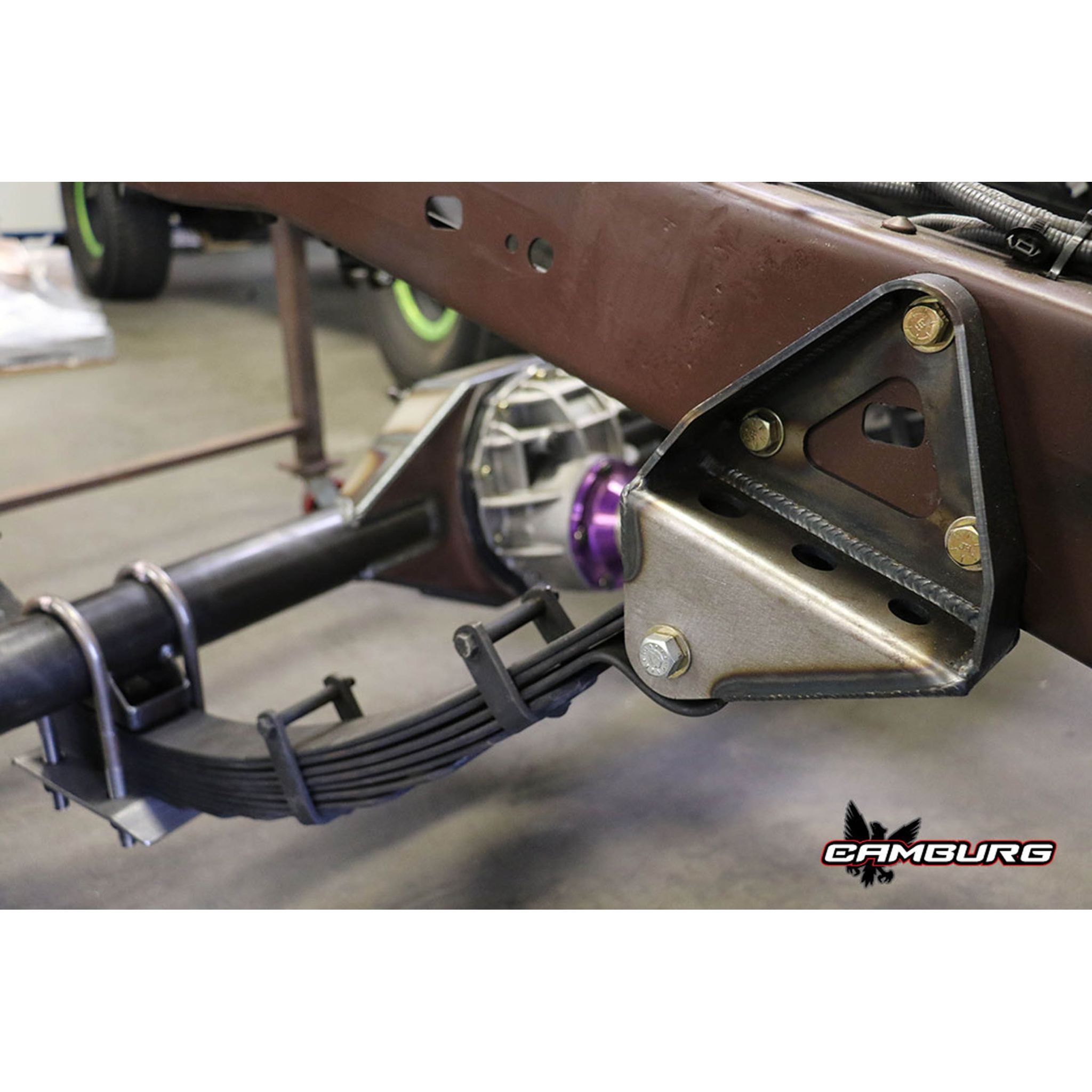 When we designed our spring-under kit for the 2005-2023 Toyota Tacoma’s we wanted to take the guess work out and make a kit that’s easier to install. We did this by designing the front and rear spring hangers to bolt to the frame using the existing holes used by the factory mounts that are riveted on. Our mounts are considerably stronger than weld-on versions and we incorporated tabbing on the rear mounts for a x-member or fuel cell cradle for even more strength. This race and BITD 7100 class championship winning kit has been used over the years on serious prerunners and race trucks in the deserts of California and as far as the Dakar rally. A limited travel variation of this kit was also used on the 2017 Tacoma we raced in the 2017 Mint 400 in the 7300 class. This suspension kit is for the serious builder/enthusiast and is intended to be used with a bed cage and 2.5-3.0 x 16-18? travel shocks through the bed along with FOX or King bump stops. Their is quite a bit of work involved with installing these parts and is not an entry level install. Leaf springs are not included.