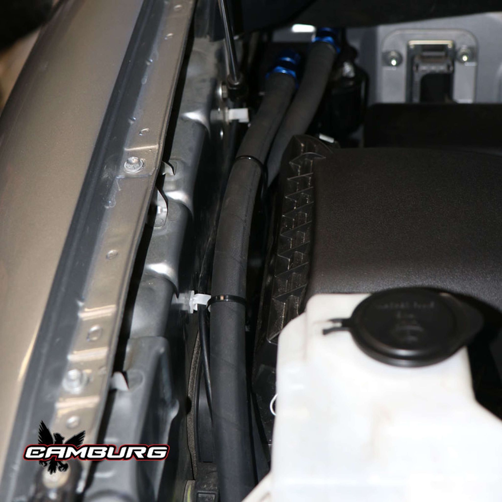 This is a mandatory upgrade when running fiberglass front fenders. The problem you run into when installing fiberglass fenders is you lose the factory inner fenders which exposes the engine smog/air pump and its inlets. This allows dirt and water to enter which damages the pump and is a very expensive fix not covered under warranty. This kit relocates the inlets to inside the engine bay area and uses KandN filters to insure water and dirt is kept out. We use XRP hose and fittings that match up to our aluminum bracket that holds the filters. This bracket bolts to the inner sheet metal using supplied hardware and drill template.