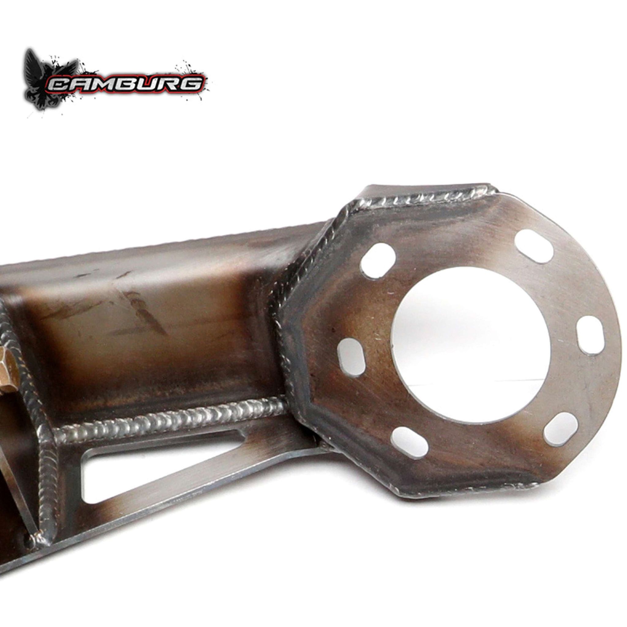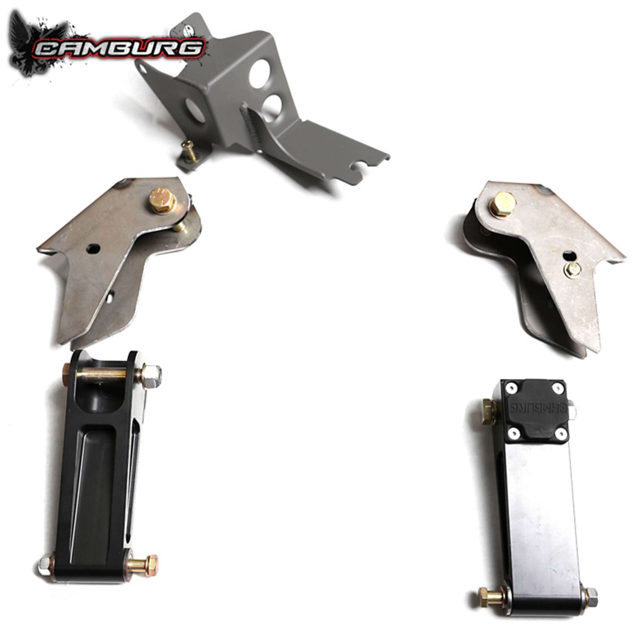 Adding bump stops to our Ford Raptor long-travel kit and stock length performance lower arms is easy with our 2.5 Slapper Bump Stop kit since the lower arms are already tabbed for it. Adding a 2.5 bump stop adds a ton more control and bottoming resistance. This allows for a soft plush ride through the small stuff that doesn’t bottom out easily through the bigger hits and g-outs. This is a great add-on that makes a significant improvement off-road without taking away from ride quality on the street. Why a slapper arm setup you ask? The main benefit is it allows the air bump to strike further outboard on the lower arm making it much more effective and efficient. We’re able to keep the motion ratio geometry consistent through the bottoming out travel so there is constant contact with the lower arm and the bump stop isn’t swiping the lower arm. The bump stops only comes into play toward bottoming and allows free movement in the “ride zone" so the suspension is more active in that range. With the slapper arm design we’re also able to incorporate a custom rubber pad to reduce noise on contact. This setup also doesn’t inhibit the routing of the coilover remote reservoir lines. Last but not least, it’s really cool too. This is designed for our custom FOX or King 2.5 bump stops that work more like an air shock. We’ve spent extensive time testing getting these dialed in for our kits. We have the FOX's cerakoted gray which is a high performance ceramic coating used in FOX’s trophy truck race shocks. We supply aircraft AN bolts for the upper and lower mounts that have the proper grip/shoulder length for maximum strength. We also include bolt-on brackets to relocate the driver-side ABS module and passenger side wiring harness at the frame for proper clearance and routing. Mounts come raw as they need to be welded on. We recommend spraying them with black Steel-IT after welding. Welding is required to install the bump stop mounts For use with Camburg lower control arms only.