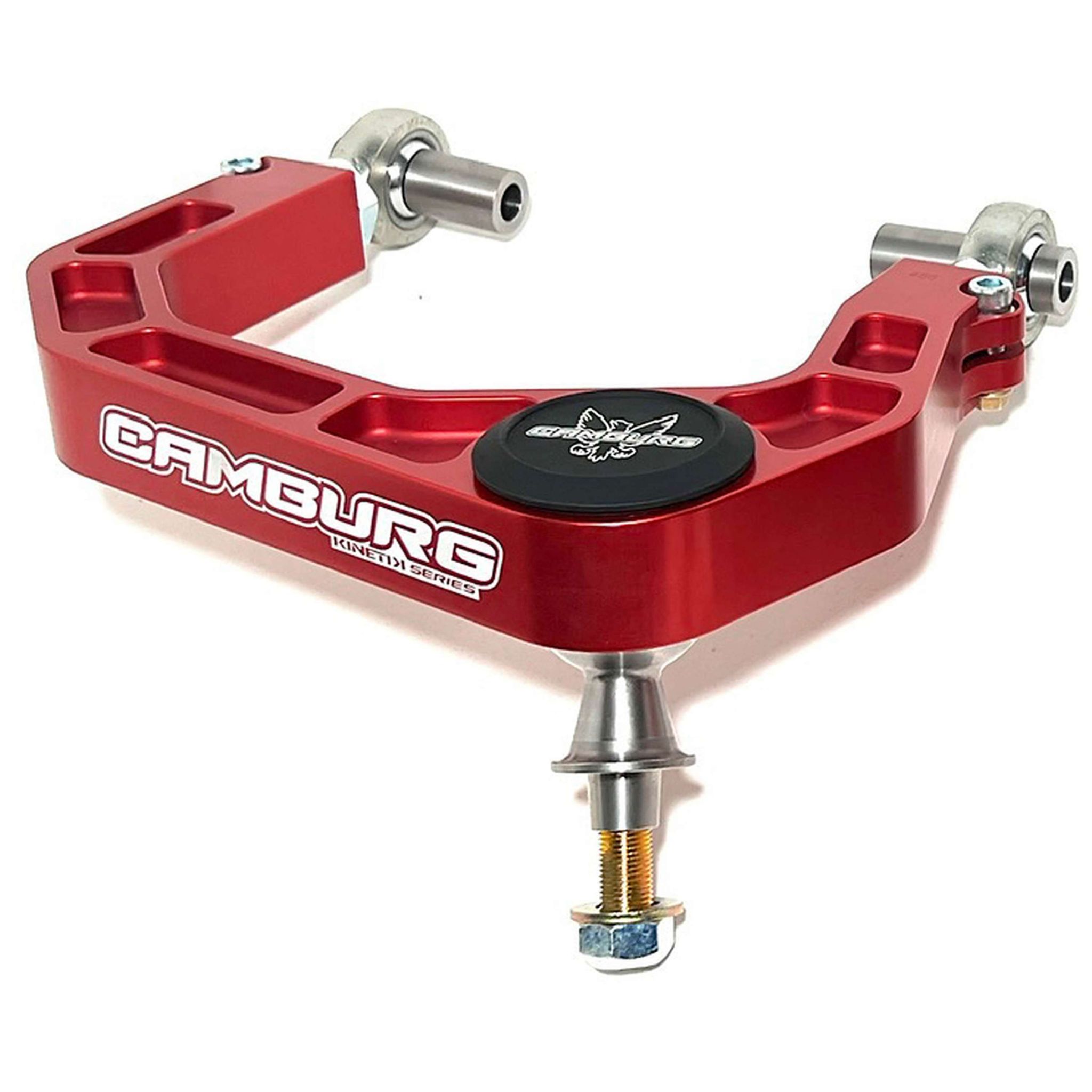 Countless hours were spent designing and refining these arms to the point where they met our high standards. CAD designing and machining gave us the ability to bring some new design elements and features to the table. We CNC machine these from aerospace quality 6061 billet aluminum, then send them out to be bead blasted, Type II anodized red and have our Camburg logo laser etched. Like our tubular arms we use a larger FK 1.25” uniball that has a PTFE liner for increased strength and mis-alignment for maximum useable wheel travel. Made in the USA these are far superior to the cheaper and smaller imports other companies use. Adapting the uniball to the spindle/knuckle is done using model specific spacers that match the factory taper precisely. These are machined from heat-treated stainless steel and are a one piece design for increased strength. No drilling or modifications are needed. The 1.25” uniball gives us the ability to run a larger bolt with a low profile press-on uniball cap to resist the elements. Using larger and stronger FK 7/8” chromoly heim joints allows for additional camber and caster adjustment if needed. Using a heim joint also eliminates flexing/deflection under hard use and braking with zero binding when in use. Using AN/Mil-spec hardware we have a single pinch bolt and secondary jam nut to insure the heim is secure with the rigors of off-road use.