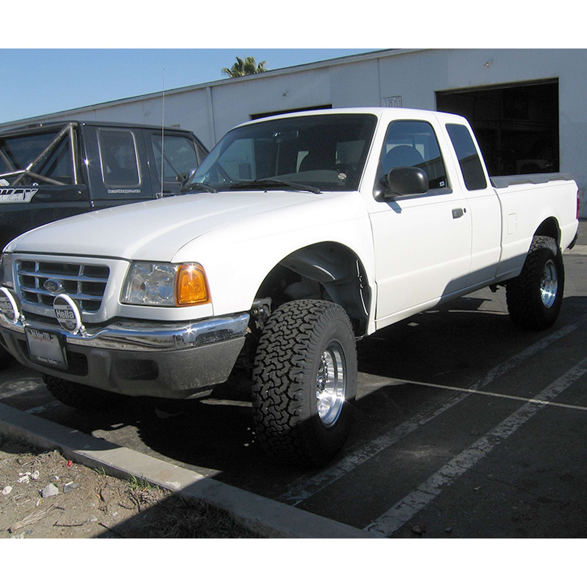 Our 6.0 kit for the RWD Ford Rangers set the bar years ago as the best performance kit available. The kit uses our 3" lift fabricated race spindles with a massive 1" vertical uniball that replaces the weak upper ball-joint that is prone to fail. This allows for 10" of useable wheel travel. The upper arms are made from 1.50" x.120 wall 4130 chromoly tubing and double shears the uniball. We use Bilstein 5100 series shocks for added control and are valved for this kit. By adjusting the torsion bars you can setup the front end with 4-6" of lift. Track width is increased 1.5" per side giving you a wider stance for better stability and added wheel travel. This is why Fiberglass front fenders are highly recommended. We now include our weld-on upper frame gusset reinforcement kit. This kit fits RWD Rangers with torsion bars only. For coil spring trucks use our Ranger XLT 5.5 kits.** This also fits RWD 1995-2005 Explorers and 2001-2006 SportTrac’s with 11.25" brake rotors. Call for more info. 4-6" of lift 8" of wheel travel 1.5" wider per side Made in the USA Must re-use the factory OEM spindle snouts/pins. Aftermarket versions will not work Fiberglass front fenders required to run 33" tires.