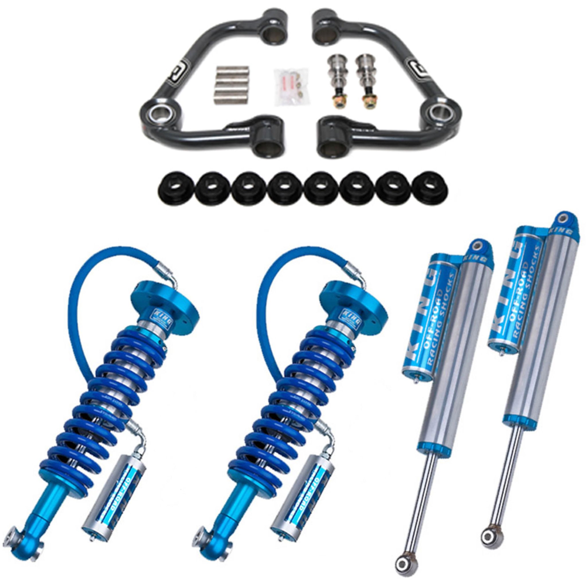 Our King 2.5 Performance kit for the Ford F-150 takes our leveling kit to the next level. We utilize Kings’s 2.5 series front coilovers. This combination of parts not only improves the ride and handling on-road but more so off-road with the larger diameter shocks. With the upper arms these shocks increase wheel travel. Improved ride both on and off-road Eliminates weak upper ball-joint Increased wheel travel Corrected suspension geometry Made in the USA After lifting your truck, the stock upper arms become the limiting factor and hold back your suspensions performance. Our upper arms address these issues and more. You can choose between our tubular and billet uniball arms depending on your budget and type of use. We’re able to increase wheel travel with a part that is considerably stronger and will last longer under extreme conditions. We also engineered the arms with more caster and changed the camber curve to correct geometry so the vehicle aligns correctly and improves driving characteristics and handling both on and off-road. For more info on all our arms, check out their individual product pages to help make your choice. In the rear we go with a pair of King’s 2.5 remote res. shocks. They have a substantial increased oil capacity due to their size and have a lot more control and damping. The compression adjuster allows you to tune the shock softer and firmer depending on what you’re looking for and how you’re the truck. Since they are longer in length they increase rear wheel travel and articulation. Note: factory 20" wheels will not clear the upper arm and may require a wheel spacer. We highly recommend aftermarket wheels with the correct offset with all our Ford kits for optimum performance and fit. Note: factory 20" wheels will not clear the upper arm and may require a wheel spacer. We highly recommend aftermarket wheels with the correct offset with all our Ford kits for optimum performance and fit.
