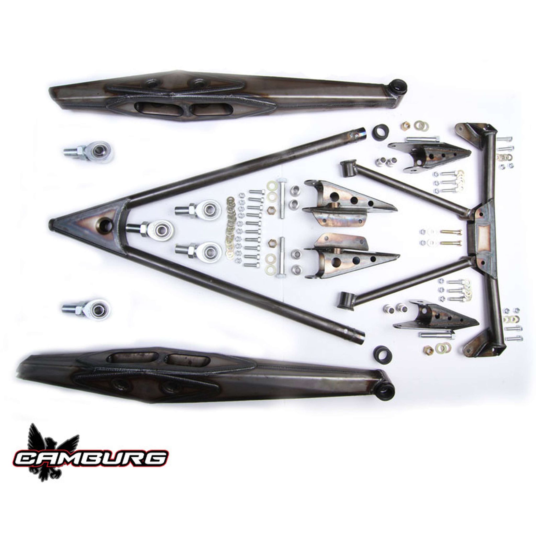 This is the most complete rear link kit out there today for the Ford Ranger and the best! We offer two different kits, one for the older I-beam trucks and the other for the newer a-arm trucks. Geometry and mounting locations are designed for the extra-cab models. If you have a single cab ranger we can sell you the kit minus the driveshaft carrier bearing strut frame as it's not needed. This kit is not only heavily race proven but is also championship winning. This is the same kit we raced on for years in our Camburg Ranger Edge 7200 unlimited truck. With the geometry and handling characteristics we built into this kit and the Ranger having narrow frame rails we choose to do the upper links as a more complicated 3-link design vs the traditional 4 link. Even though its more difficult to build this way, we feel it offers better articulation on the roll center axis and better geometry. The mounting brackets for the lower links and upper wishbone bolt to existing holes in the frame for proper positioning. They also tie into one another for added strength with the carrier bearing mount and strut bars. We don't use a cheap polyurethane or Delrin bushing for any of the pivots. We only use 1" uniballs and heims just like in our KINETIK 6100/TT race trucks. We supply you with all Made in the USA FK heims and uniballs along with grade 8/9 hardware. Combine this with one of our Camburg rear ends for the complete suspension and driveline package. These require your shocks to use 3" longer lower rod ends with 1/2" x 1.50" spacers. The lower link mounts on the axle tube need to have a 46" spread on center and positioned forward perpendicular to the face plate. See CAD drawing in photo gallery. We try and keep this kit in stock, but many times is "made to order". This kit is for the serious racer and requires extensive fabrication and vehicle modifications. We recommend a qualified off-road race shop to install and setup this suspension system. This is for "off-road use only".
