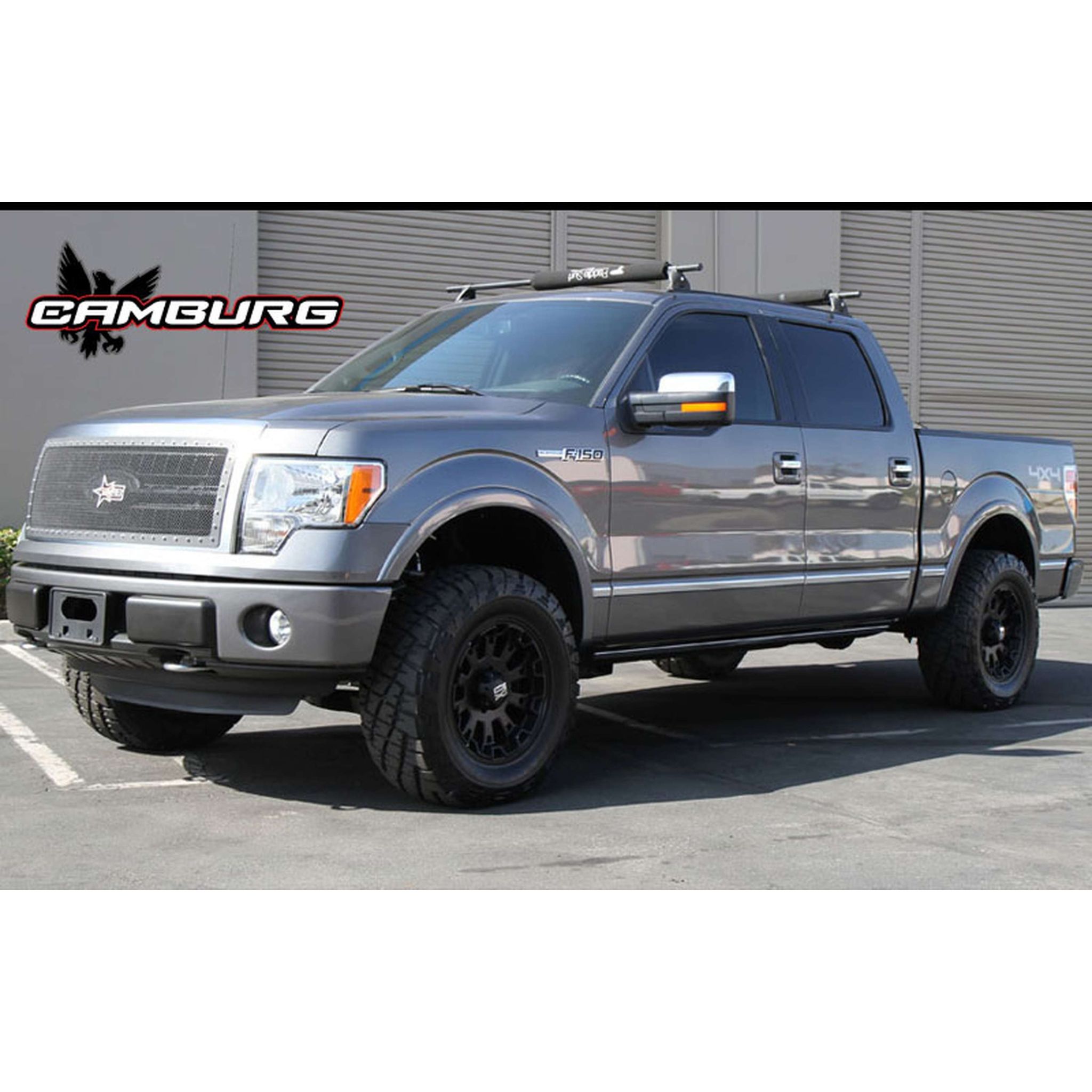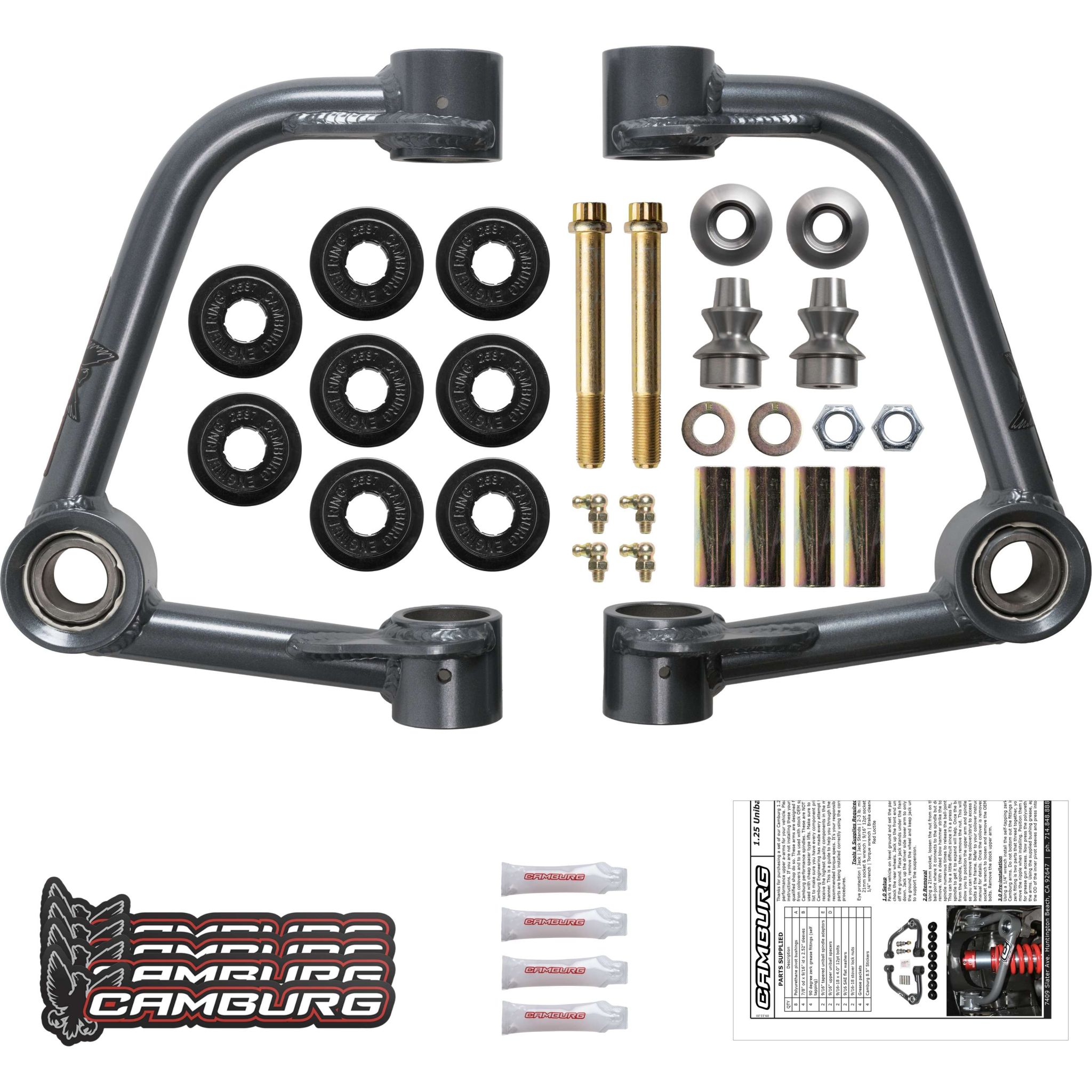When lifting your truck, the stock upper arms become the limiting factor and hold back your suspensions performance. Our Camburg upper arms address these issues and more. Replacing the stock ball-joint with a larger 1.25 uni-ball bearing we’re able to gain wheel travel with a part that is considerably stronger and will last longer under extreme conditions. We build more caster and change the camber curve to correct geometry so the vehicle aligns correctly and improves driving characteristics and handling. Using the latest CAD/CAM engineering software we design these arms to the strictest standards using our FARO laser scan arm to model the OEM parts and frames. Manufactured in-house, we have the tubes CNC laser cut and bent, then are MIG welded in precision fixtures before sending out to be sandblasted and powder-coated. Our in-house CNC machine shop makes all the machined parts including the uniball mis-alignment spacers from heat-treated stainless steel. We pride ourselves in producing the best parts available under our own roof and control. Increases usable wheel travel Corrects camber and caster Eliminates weak factory ball-joints Thicker.156" wall round tubing Laser cut and CNC bent tubes MIG welded CAD/CAM engineered Polyurethane frame pivot bushings with grease-able zerk fittings FK 1.25" PTFE-lined uniballs pre-installed Steel gray powder-coating All necessary hardware included and ready to install Made in the USA Designed for 1-3" of lift. Note: factory 20" wheels will not clear the upper arm and may require a wheel spacer. We highly recommend aftermarket wheels with the correct offset with all our Ford kits for optimum performance and fit.