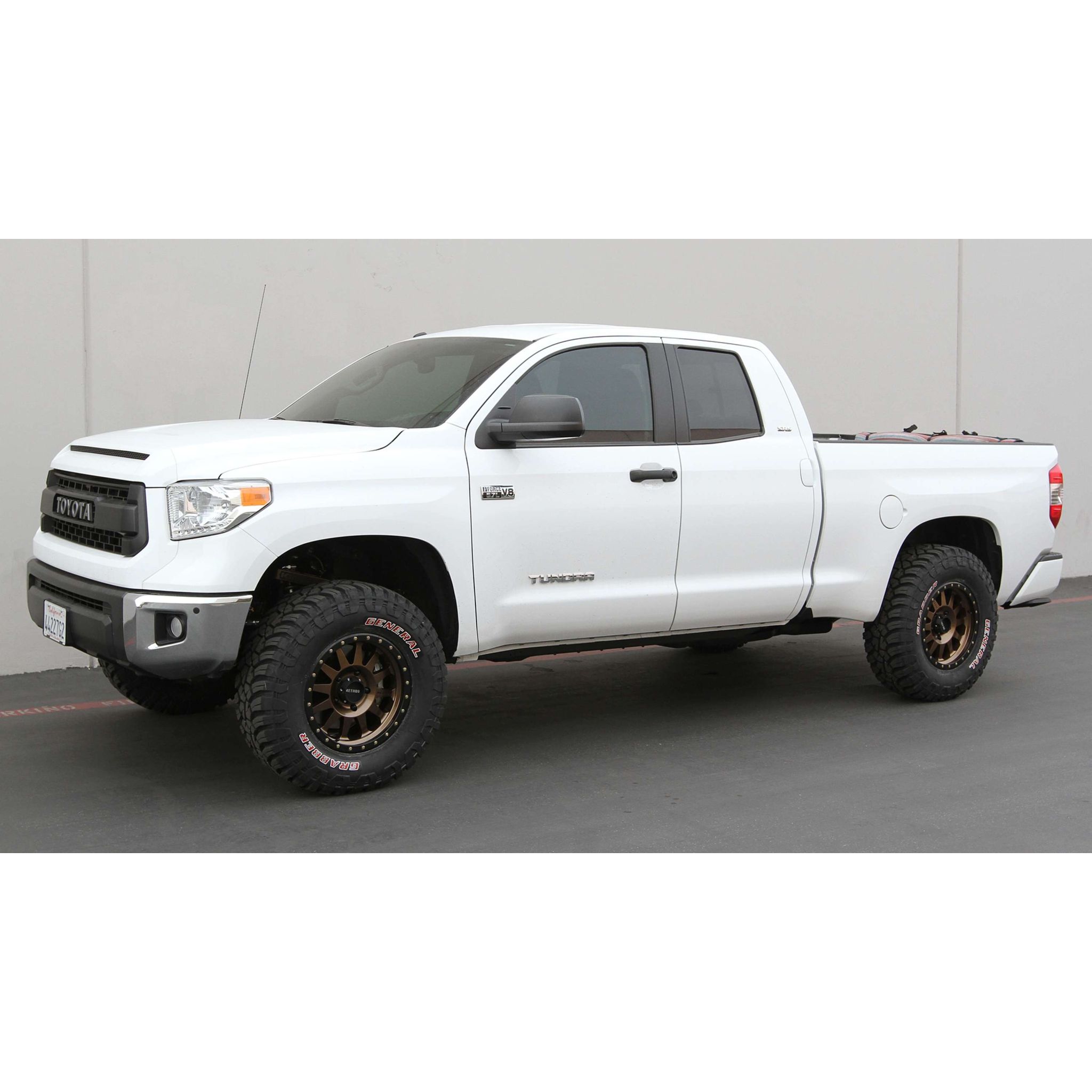 Our FOX 2.5 Performance kit is a mid travel kit for Toyota Tundra. It includes FOX 2.5 coilovers, 2.0 rear shocks, and Camburg upper arms. The kit provides 0-2 inches of lift and increased wheel travel. The shocks feature a smooth-bore, clear coated, zinc plated, honed seamless alloy body, black anodized 6061-T6 billet aluminum components, and a 7/8" hard chrome plated heat treated alloy steel shaft. The upper arms are available in tubular and billet uniball options, and they increase wheel travel and improve vehicle alignment and handling. In the rear, we use FOX's 2.0 Performance Series shocks for better off-road performance and controlled ride. Please note that modifications may be required for certain wheel sizes and tire combinations.