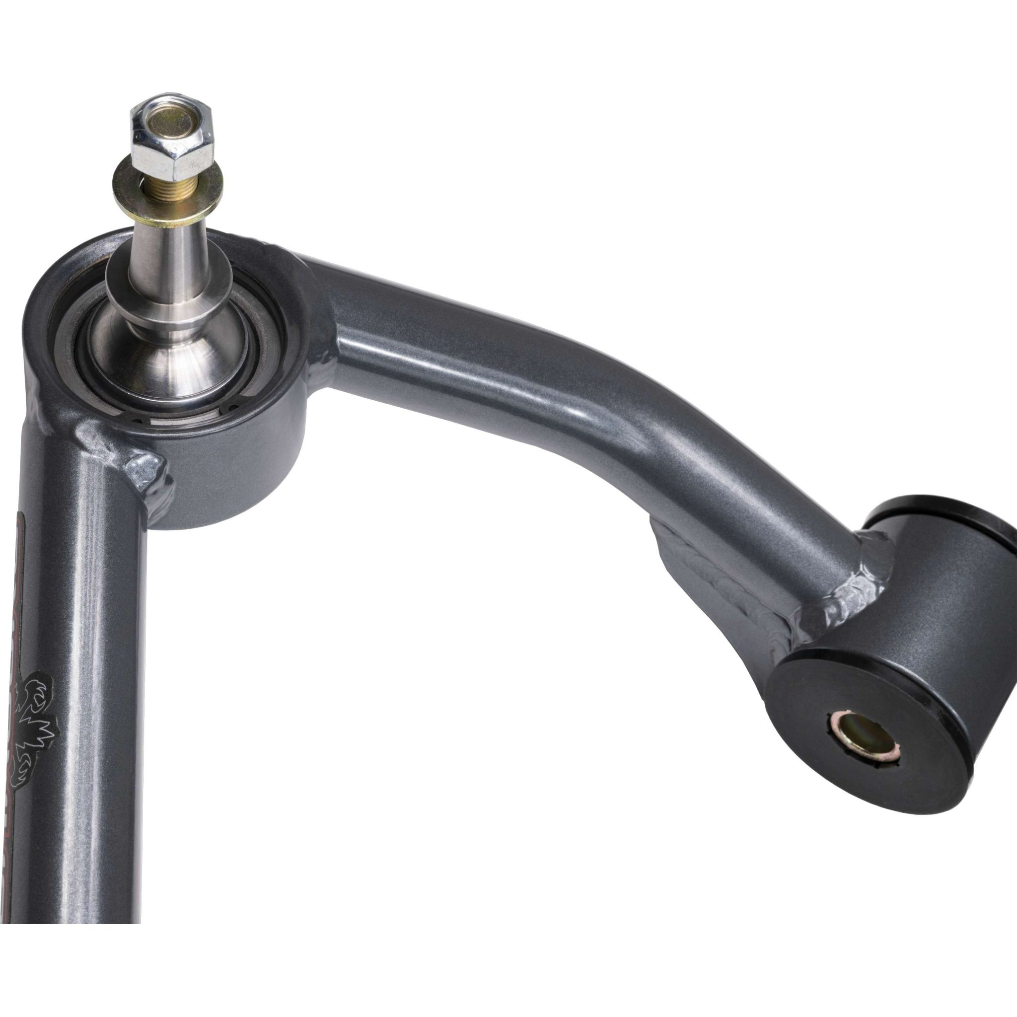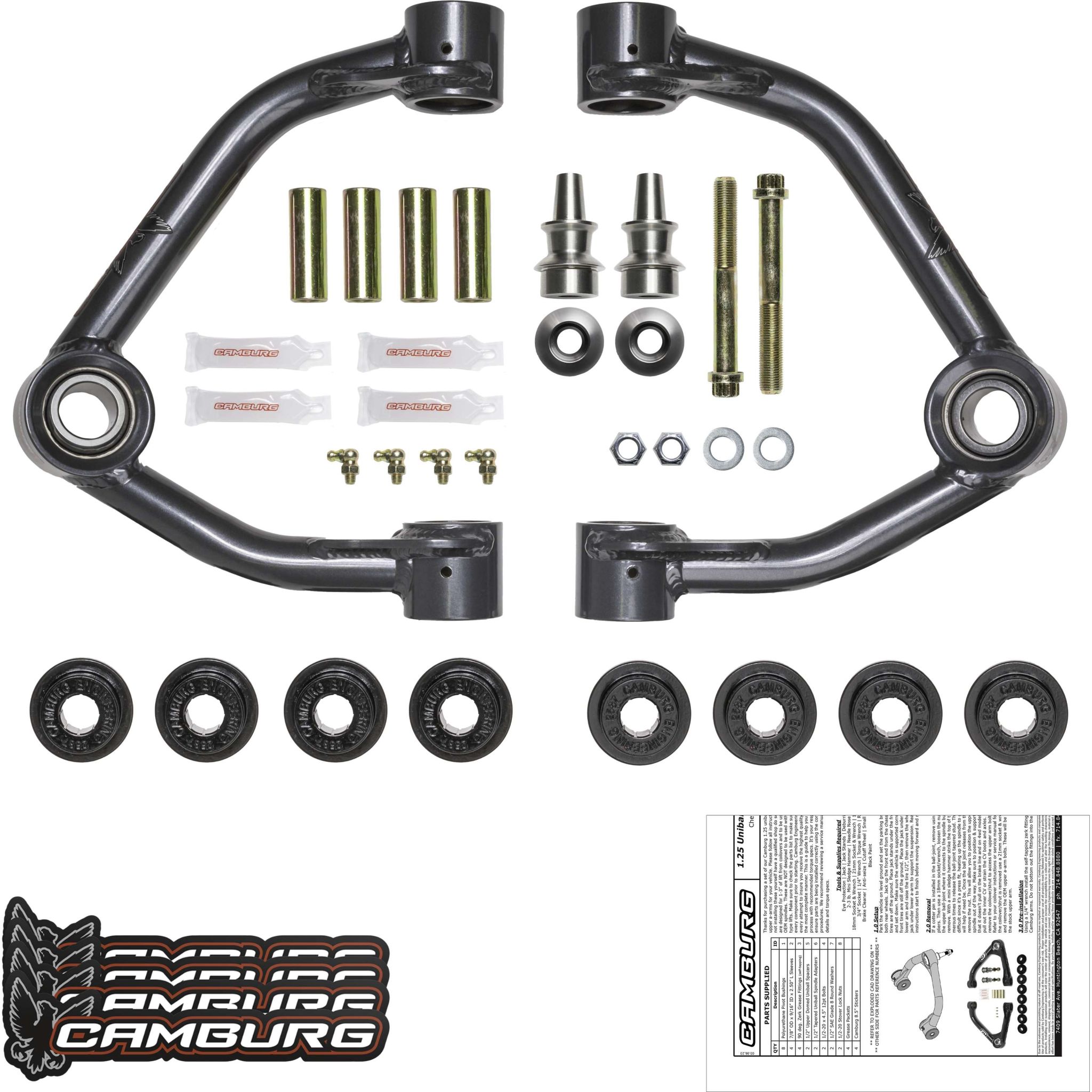 When lifting your truck, the stock upper arms become the limiting factor and holds back your suspensions performance. Our Camburg upper arms address these issues and more. Replacing the stock ball-joint with a uniball bearing we're able to gain wheel travel with a part that is considerably stronger and will last longer under extreme conditions. We build more caster and change the camber curve to correct geometry so the vehicle aligns correctly and improves driving characteristics and handling. Using the latest CAD/CAM engineering software we design these arms to the strictest standards using our FARO laser scan arm to model the OEM parts and frames. Manufactured in-house, we have the tubes CNC laser cut and bent, then are MIG welded in precision fixtures before sending out to be sandblasted and powder-coated. Our in-house CNC machine shop makes all the machined parts including the uniball mis-alignment spacers from heat-treated stainless steel. We pride ourselves in producing the best parts available under our own roof and control. Increases usable wheel travel Corrects camber and caster Eliminates weak factory ball-joints Thicker.156" wall round tubing Laser cut and CNC bent tubes MIG welded CAD/CAM engineered Polyurethane frame pivot bushings with grease-able zerk fittings FK 1.25" PTFE-lined uniballs pre-installed Steel gray powder-coating All necessary hardware included and ready to install Made in the USA Designed for 1-2.5" of lift Does not fit ZR2 models Increases usable wheel travel Corrects camber and caster Eliminates weak factory ball-joints 1.25" FK uniballs Does not fit ZR2 models Does not fit ZR2 models.
