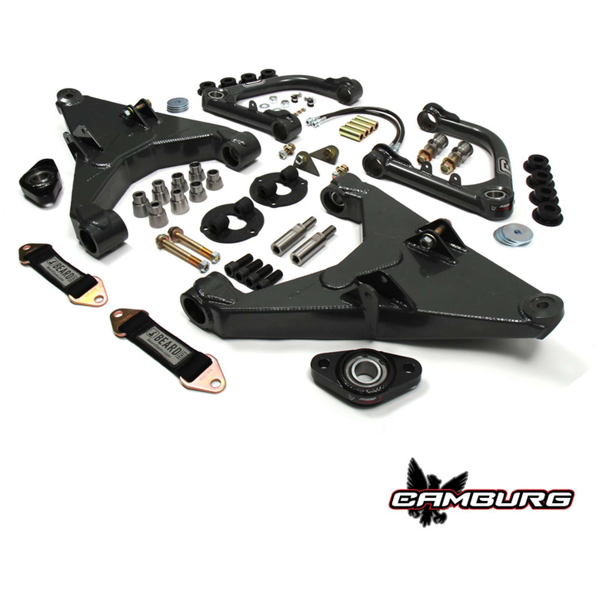 The Camburg Long Travel kit features high-performance A-Arms, including uni-balls in the lower frame pivots and a boxed race arm. The upper arm has urethane bushings with zerk fitting and 1.25" uniballs. The kit includes Camburg SPEC 8" travel 2.5" reservoir coilovers by FOX or King, which do not require cutting the stock coil-over mounts. The steering upgrade includes a heat-treated stainless steel tie-rod and inner clevis with a FK 3/4" heim joint. This kit provides up to 15" travel on a 2×4 and 14" on a 4×4. It can be upgraded with a weld-on bypass shock mount and a custom FOX or King 2.5" 3 tube bypass shock. Fiberglass front fenders are required. Professional installation is recommended. RWD models can run a coilover, bypass shock, and air bump stop, while 4WD models can run a coilover and air bump stop or coilover and bypass shock. Specific L/T kit coilovers and L/T axles are required for installation. The shock specs for the kit include 2.5 x 8" remote coilovers with DSC adjusters.