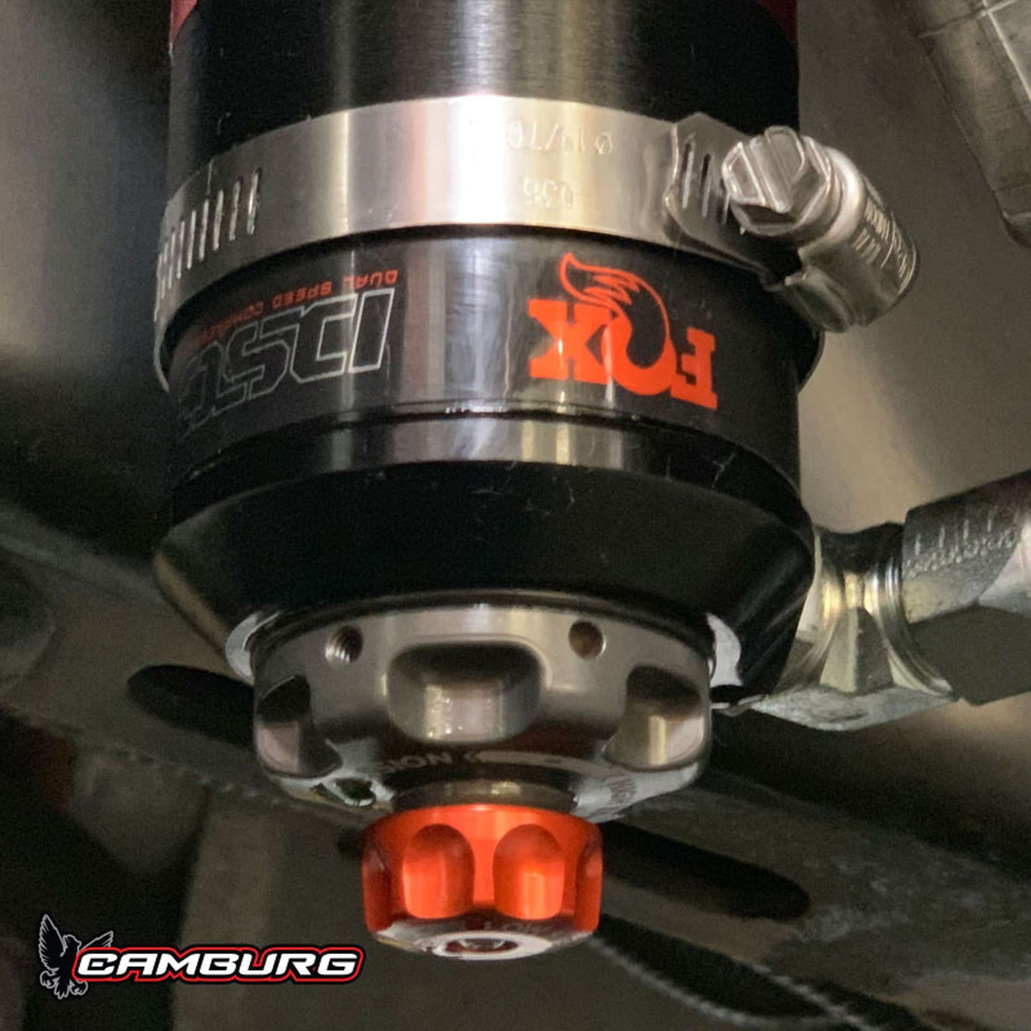 Countless hours were spent designing and refining these arms to the point where they met our high standards. CAD designing and machining gave us the ability to bring some new design elements and features to the table. We CNC machine these from aerospace quality 6061 billet aluminum, then send them out to be bead blasted, Type II anodized blue and have our Camburg logo laser etched. Like our tubular arms we use a larger FK 1.25” uniball that has a PTFE liner for increased strength and mis-alignment for maximum useable wheel travel. Made in the USA these are far superior to the cheaper and smaller imports other companies use. Adapting the uniball to the spindle/knuckle is done using model specific spacers that match the factory taper precisely. These are machined from heat-treated stainless steel and are a one piece design for increased strength. No drilling or modifications are needed. The 1.25” uniball gives us the ability to run a larger bolt with a low profile press-on uniball cap to resist the elements. Using larger and stronger FK 7/8” chromoly heim joints allows for additional camber and caster adjustment if needed. Using a heim joint also eliminates flexing/deflection under hard use and braking with zero binding when in use. Using AN/Mil-spec hardware we have a single pinch bolt and secondary jam nut to insure the heim is secure with the rigors of off-road use. These heims are considerably stronger than the smaller and cheaper versions many competitors use.