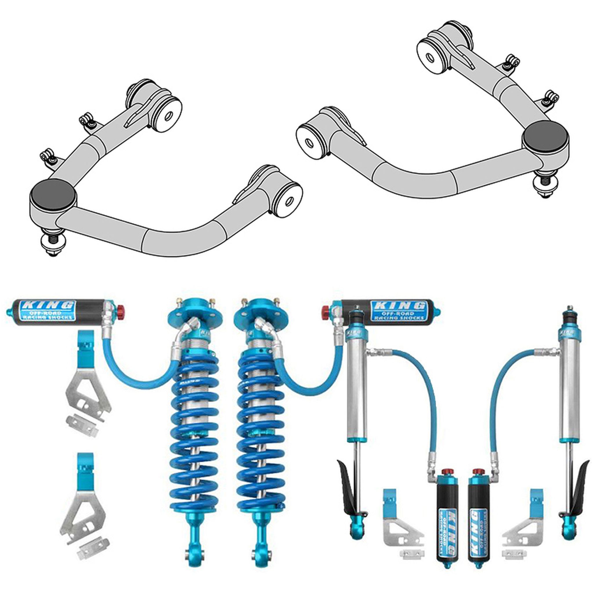 Our King 2.5 performance kit for the ’22-25 Toyota Tundra’s takes your stock suspension to the next level. We utilize Kings’s 2.5 series front coilovers with compression adjusters. This combination of parts not only improves the ride and handling on-road but more so off-road with the larger diameter shocks and external reservoirs. These 2.5 coilovers are designed to be used with our Camburg upper arms for maximum useable wheel travel and performance. These also have King’s finned aluminum reservoirs that aid in lowering shock temps under hard use. After lifting your truck, the stock upper arms become the limiting factor and hold back your suspensions performance. Our tubular uniball upper arms address these issues and more. We’re able to increase wheel travel with a part that is considerably stronger and will last longer under extreme conditions. We also engineered the arms with more caster and changed the camber curve to correct geometry so the vehicle aligns correctly and improves driving characteristics and handling both on and off-road. In the rear we go with a pair of King’s 2.5 remote res. shocks. The compression adjuster allows you to tune the shock softer and firmer depending on what you’re looking for and how you’re using the truck. Since they are longer in length they increase rear wheel travel and articulation. These also have King’s finned aluminum reservoirs that aid in lowering shock temps under hard use. As an upgrade we recommend our rear trailing arms. They’re considerably stronger, pivot on 1? FK uniball bearings for more wheel travel and articulation.