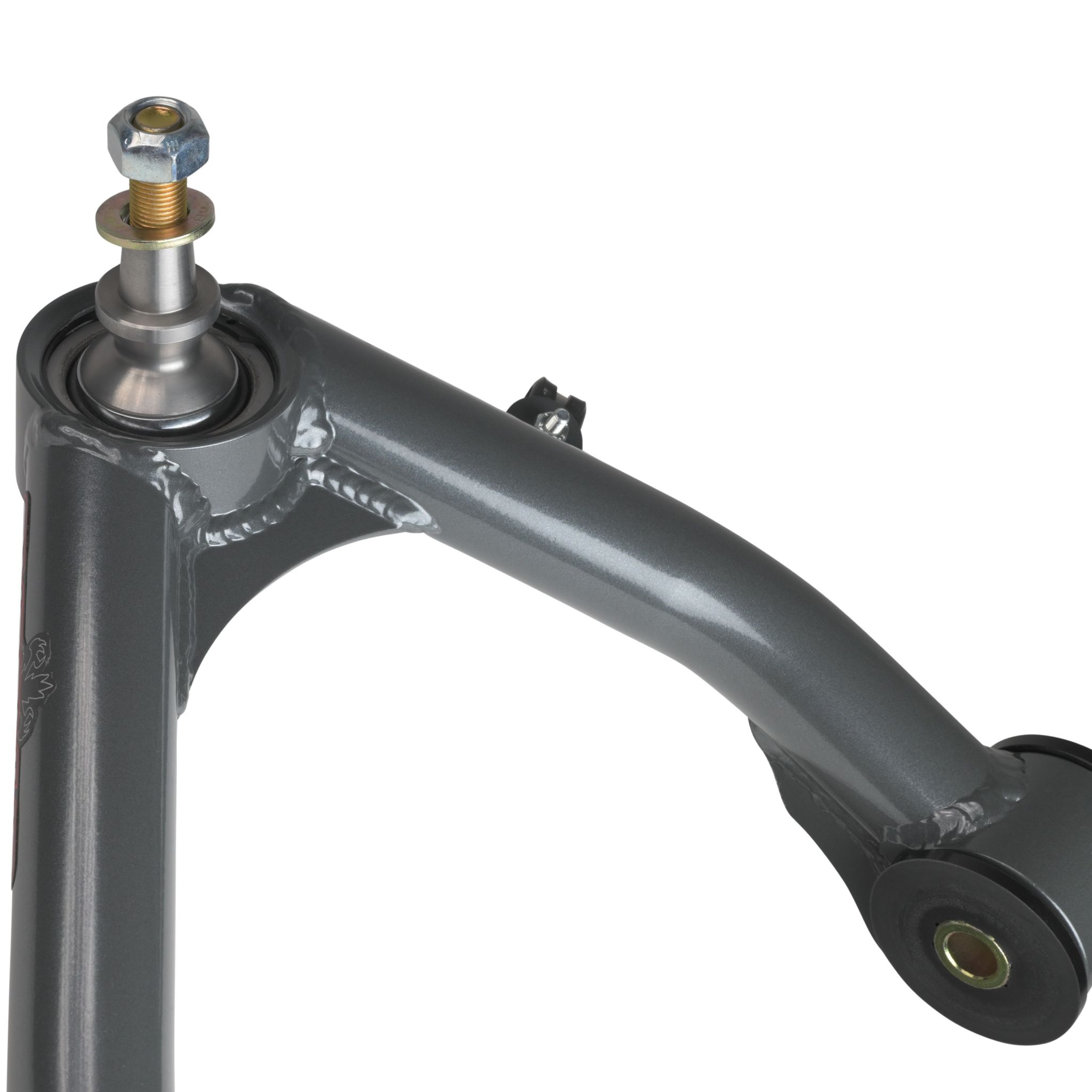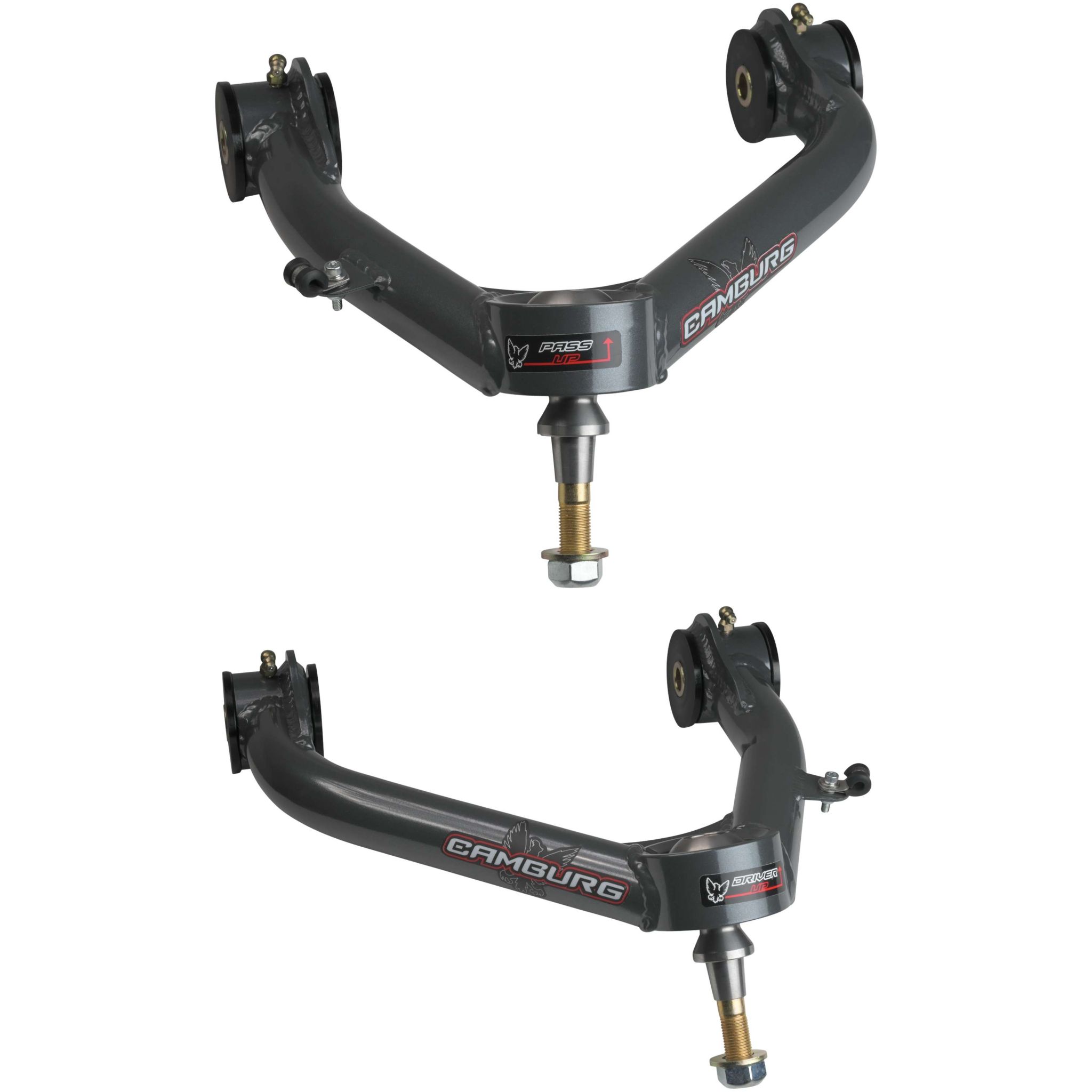 Our Camburg upper arms are designed to address the limitations of stock upper arms when lifting your truck. By replacing the stock ball-joint with a larger 1.25 uni-ball bearing, we improve wheel travel and durability under extreme conditions. We also adjust the caster and camber curve to correct geometry, enhancing driving characteristics and handling. Our arms are meticulously engineered using CAD/CAM software and our in-house CNC machine shop produces all the necessary machined parts. The arms are made from thick .156" wall round tubing, laser cut and CNC bent, and MIG welded in precision fixtures. They are then sandblasted and powder-coated for a durable finish. The arms come with polyurethane frame pivot bushings with grease-able zerk fittings and FK 1.25" PTFE-lined uniballs pre-installed. All necessary hardware is included for installation. The arms are designed for 1-3" of lift and also fit '07-20 Tahoe/Yukon SUVs (without electronic controlled suspension). Please note that some factory wheels may require a wheel spacer and we recommend aftermarket wheels with a zero offset for optimum performance and fit. The factory droop stop must be removed from the frame mount. Our Camburg upper arms are proudly made in the USA and are the best available for your truck.