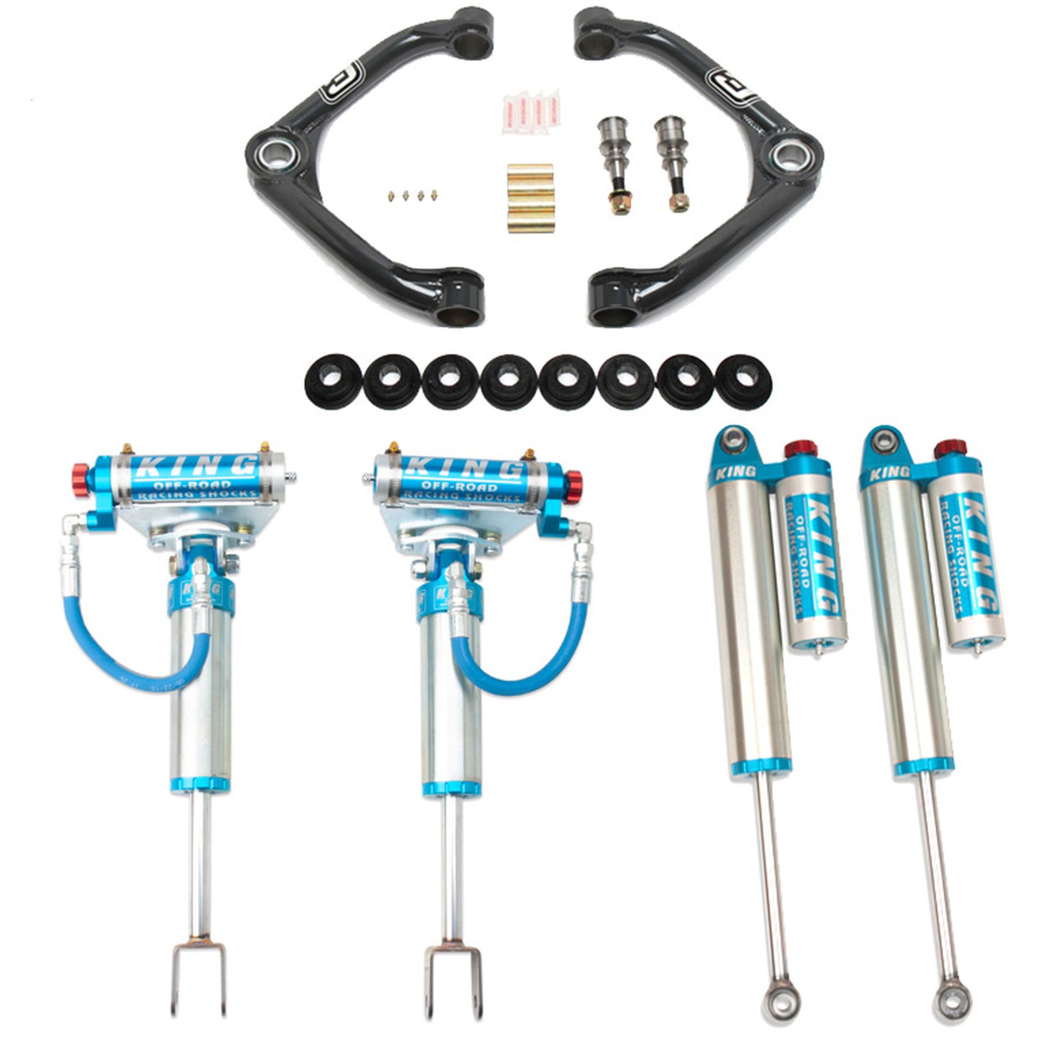 Our Performance 2.5 kit for the '11-19 Chevrolet/GMC 2500 HD's takes our leveling kit to the next level. We utilize the same Camburg 1.25" uniball upper arms but combine them with KING's 2.5 series front and rear shocks with compression adjusters. This combination of parts not only improves the ride and handling on-road but more so off-road with the larger diameter shocks and external reservoirs. With the upper arms these shocks increase wheel travel and give you the ability to adjust the factory torsion keys to lift the front end all while improving the ride. Aftermarket torsion keys are not needed and are a waste of. Improved ride both on and off-road Eliminates weak upper ball-joint Increased wheel travel Corrected suspension geometry Made in the USA 0-2" lift Improved ride and handling Increased wheel travel.