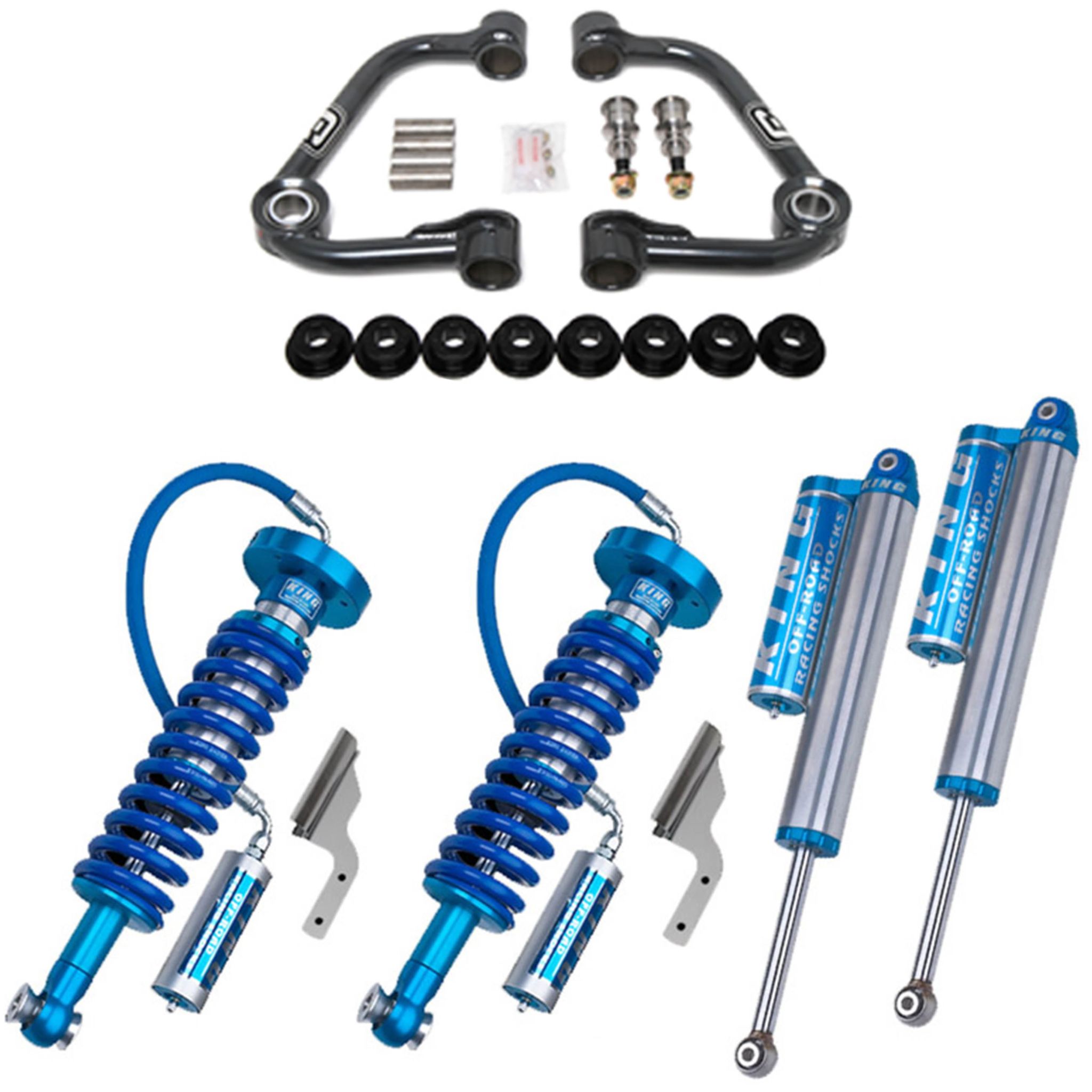Our King 2.5 Performance kit for the Ford F-150 takes our leveling kit to the next level. We utilize Kings’s 2.5 series front coilovers with compression adjusters. This combination of parts not only improves the ride and handling on-road but more so off-road with the larger diameter shocks and external reservoirs. With the upper arms these shocks increase wheel travel. Improved ride both on and off-road Eliminates weak upper ball-joint Increased wheel travel Corrected suspension geometry Made in the USA After lifting your truck, the stock upper arms become the limiting factor and hold back your suspensions performance. Our upper arms address these issues and more. You can choose between our tubular and billet uniball arms depending on your budget and type of use. We’re able to increase wheel travel with a part that is considerably stronger and will last longer under extreme conditions. We also engineered the arms with more caster and changed the camber curve to correct geometry so the vehicle aligns correctly and improves driving characteristics and handling both on and off-road. For more info on all our arms, check out their individual product pages to help make your choice. In the rear we go with a pair of King’s 2.5 remote res. shocks. They have a substantial increased oil capacity due to their size and have a lot more control and damping. The compression adjuster allows you to tune the shock softer and firmer depending on what you’re looking for and how you’re the truck. Since they are longer in length they increase rear wheel travel and articulation. Note: factory 20" wheels will not clear the upper arm and may require a wheel spacer. We highly recommend aftermarket wheels with the correct offset with all our Ford kits for optimum performance and fit. Note: factory 20" wheels will not clear the upper arm and may require a wheel spacer. We highly recommend aftermarket wheels with the correct offset with all our Ford kits for optimum performance and fit.