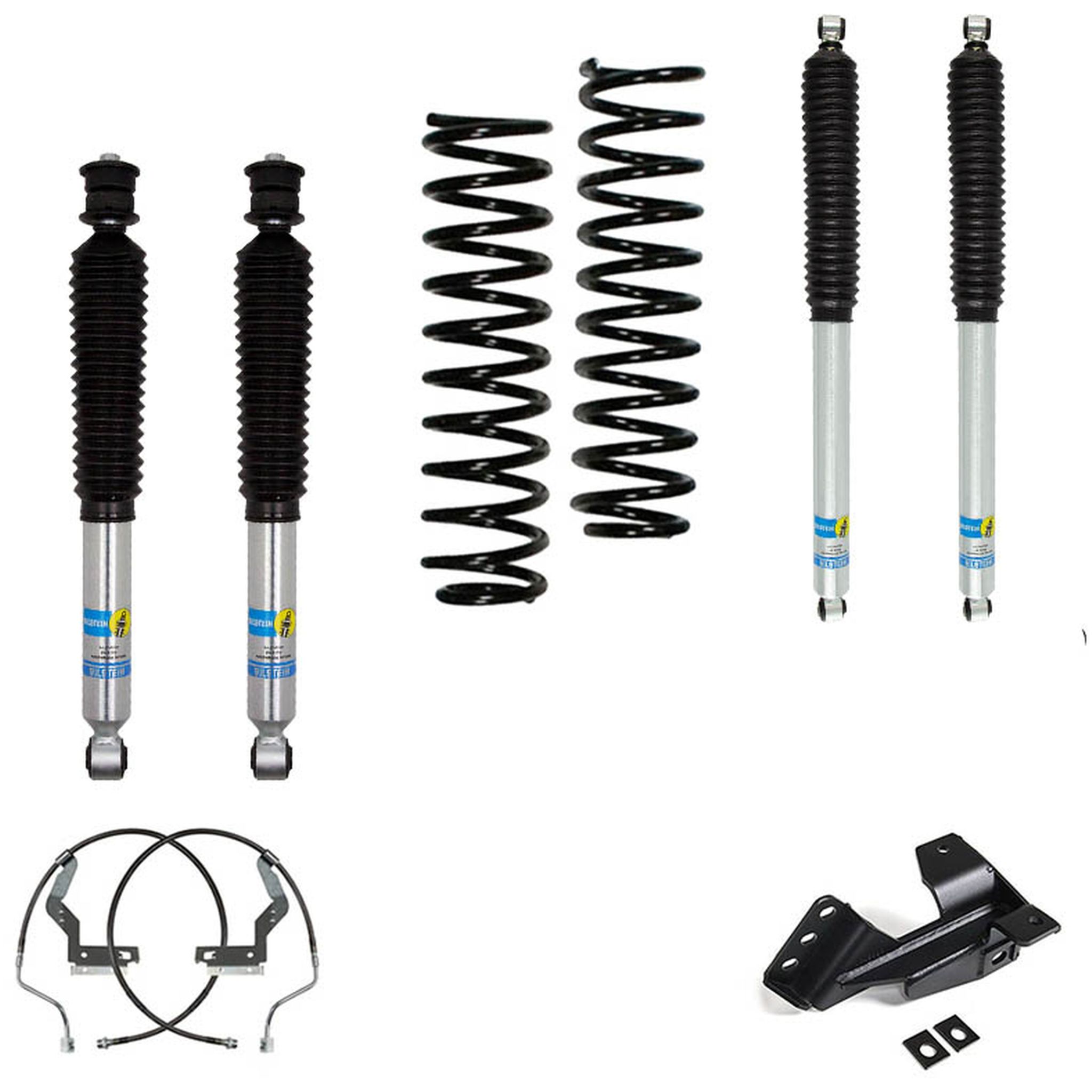 This is a great way to level out the front of your 2017-2024 4WD F-250/350 Superduty and add off-road performance while fitting up to a 37" tire. This system includes Bilstein 5100 shocks for the front and rear that are valved for both on and off-road use and a pair of our Camburg performance coil springs. We offer a specific spring for diesel or gas engines. This easily bolts on and makes a significant improvement in the ride quality and increases wheel travel. We also supply a front track bar bracket that repositions the track bar to correct the geometry and re-center the axle. We now include longer length stainless braided front brake lines with this kit. 2-2.5" front lift on '17-19 models. 3-3.5" front lift on '20-24 models. Lift amounts, tire and wheel sizing, suspension specifications, etc. are generalized as they can vary slightly from vehicle to vehicle with so many production variables between manufactures, products and vehicle options/packages from the factory. We’re supplying you the best information at our disposable along with the information supplied to us from the brands we sell.