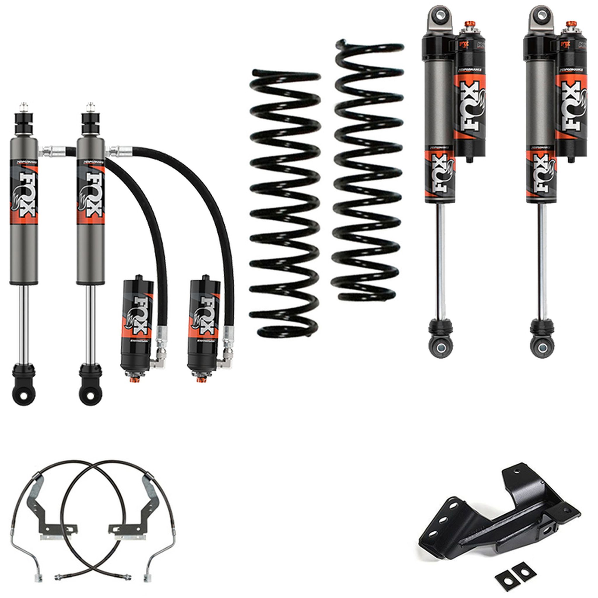 This is the ultimate way to level out the front of your 2017-2024 Ford 4WD F-250/350 Superduty and add off-road performance while fitting up to a 37" tire. This system includes FOX's NEW 2.5 Performance Elite Series DSC adjustable shocks for the front and rear that are valved for both on and off-road use and a pair of our Camburg performance coil springs. We offer a specific spring for diesel or gas engines. This easily bolts on and makes a significant improvement in the ride quality and increases wheel travel while giving you the ability to soften or firm up the ride with the DSC adjusters. We supply a front track bar bracket that repositions the track bar to correct the geometry and re-center the axle.