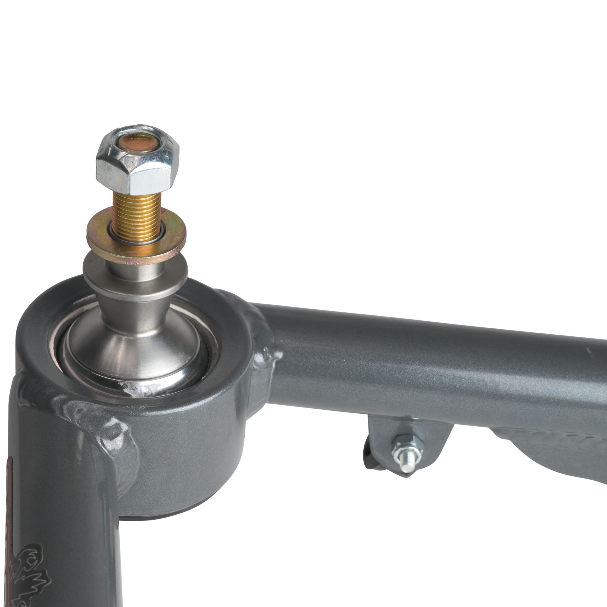 Our updated design features a billet aluminum cover for the uniball, providing protection against dirt and contaminants. The cap is press-fit and sealed with an O-ring. Our Camburg upper arms replace the stock ball-joint with a larger 1.25 uni-ball bearing, increasing wheel travel and durability. We also improve caster and camber curves for better alignment and handling. Our arms are designed using CAD/CAM software and manufactured in-house with precision welding and CNC machining. They come with polyurethane frame pivot bushings, grease-able zerk fittings, and FK 1.25" PTFE-lined uniballs. The arms are powder-coated and include all necessary hardware. They are designed for 1-3" of lift and fit 6 lug model trucks.