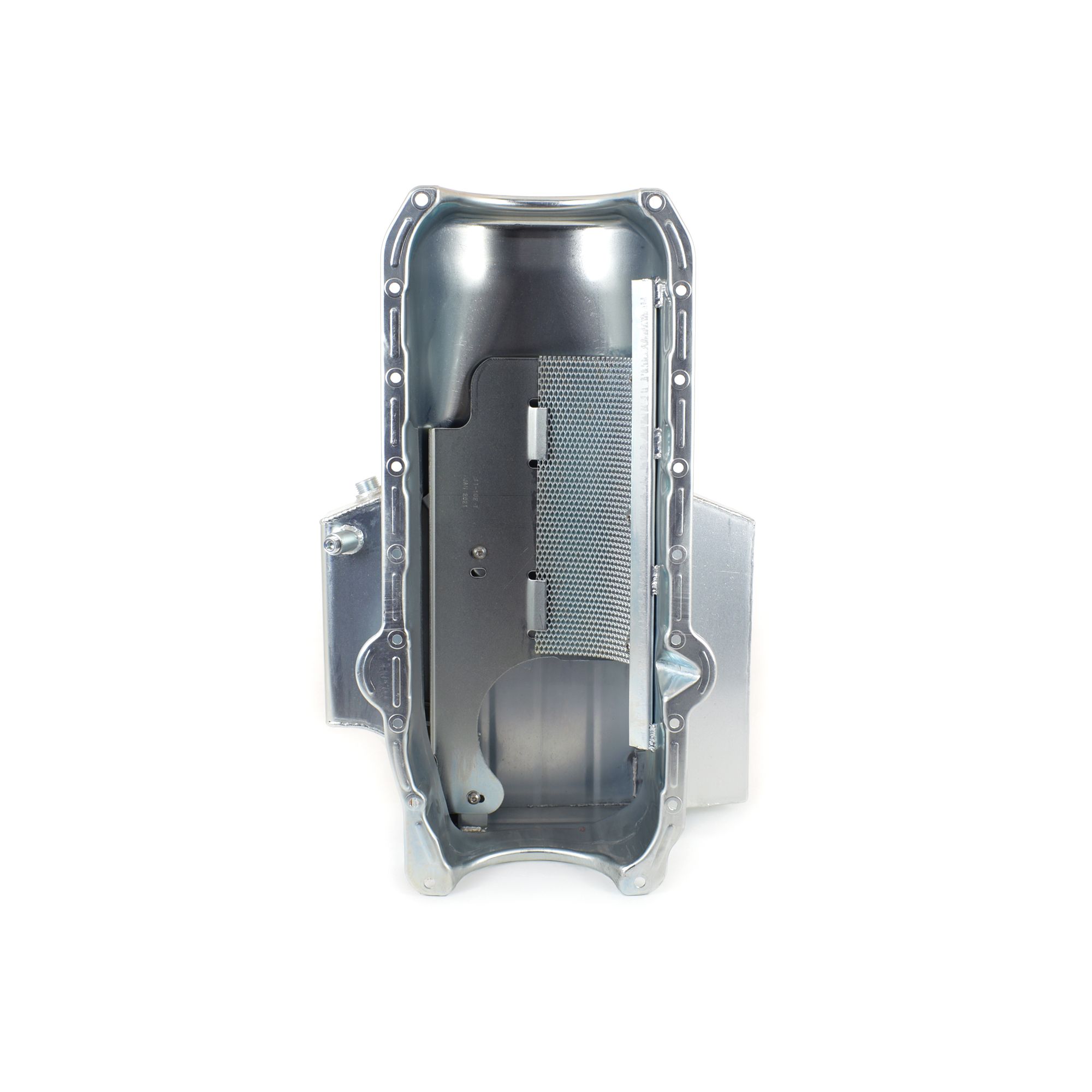This Competition wet sump is for '86 and newer Small Block Chevys with one piece seal. It is designed for applications where the engine is set extra low in the chassis. Fits front steer chassis with both aftermarket and Camaro front ends. The pan has a 6-1/2" deep, 15" wide, 12" long sump, and a 7 quart system capacity. Requires one of our pickups.