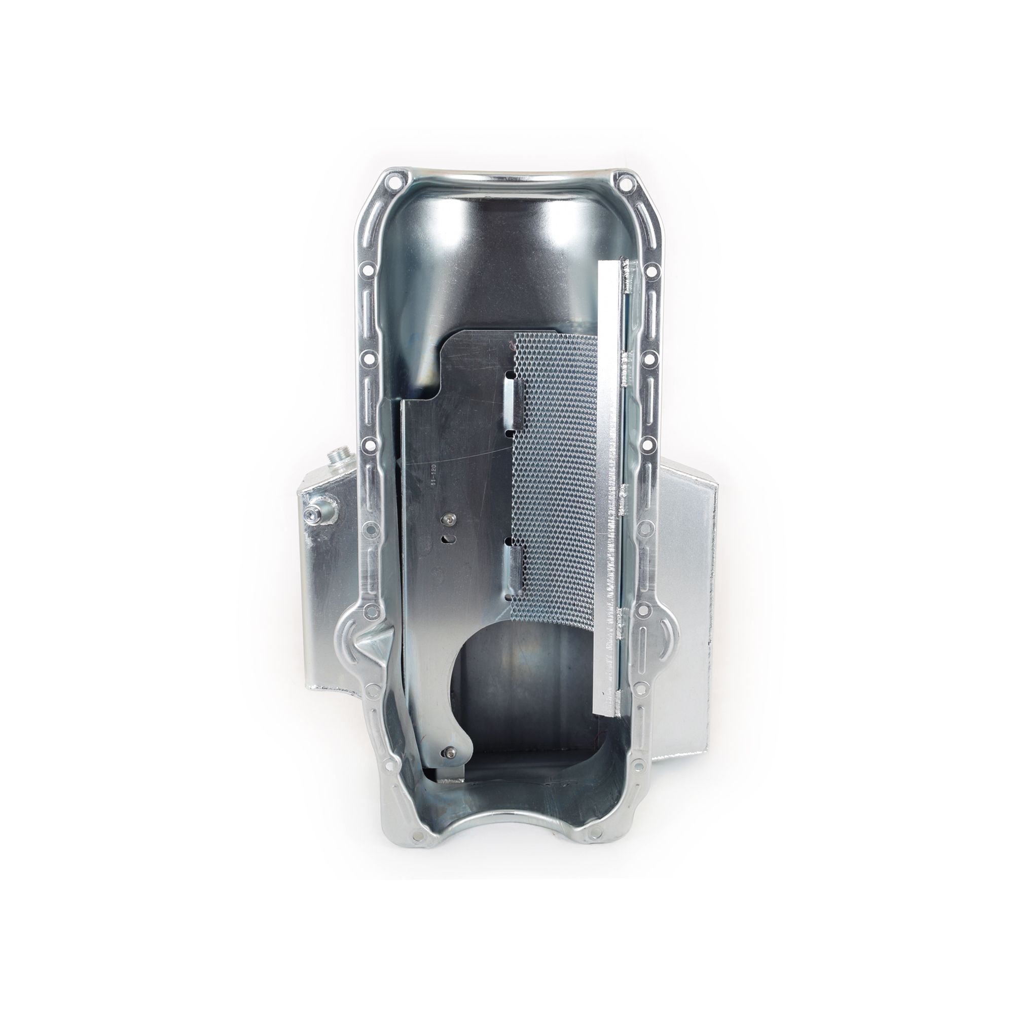 This Competition wet sump is for pre-'80 Small Block Chevys with left side dipstick. Fits front steer chassis with both aftermarket and Camaro front ends, others when the engine is moved. It has a 7" deep, 15" wide, 12" long sump, and an 8 quart system capacity. Will work with all starter and flywheel combinations. Requires one of our pickups.