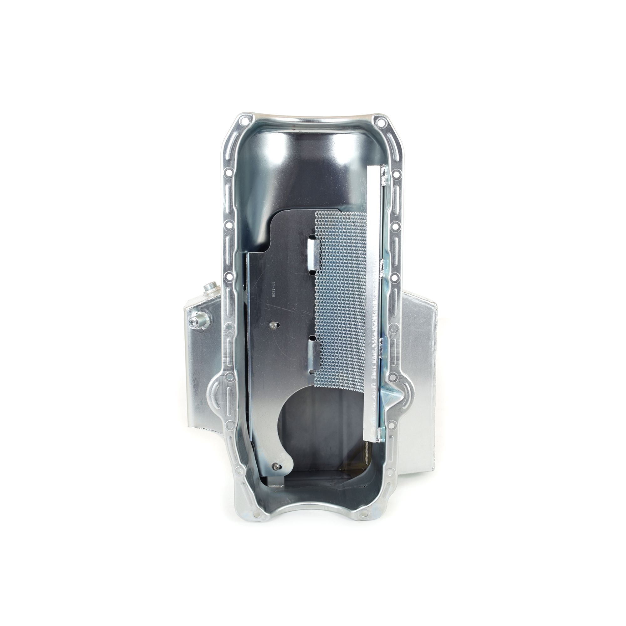 This Competition wet sump is for '80-'85 Small Block Chevys with right side dipstick. Fits front steer chassis with both aftermarket and Camaro front ends, others when the engine is moved. It has a 7" deep, 15" wide, 12" long sump, and an 8 quart system capacity. Will work with all starter and flywheel combinations. Requires one of our pickups.
