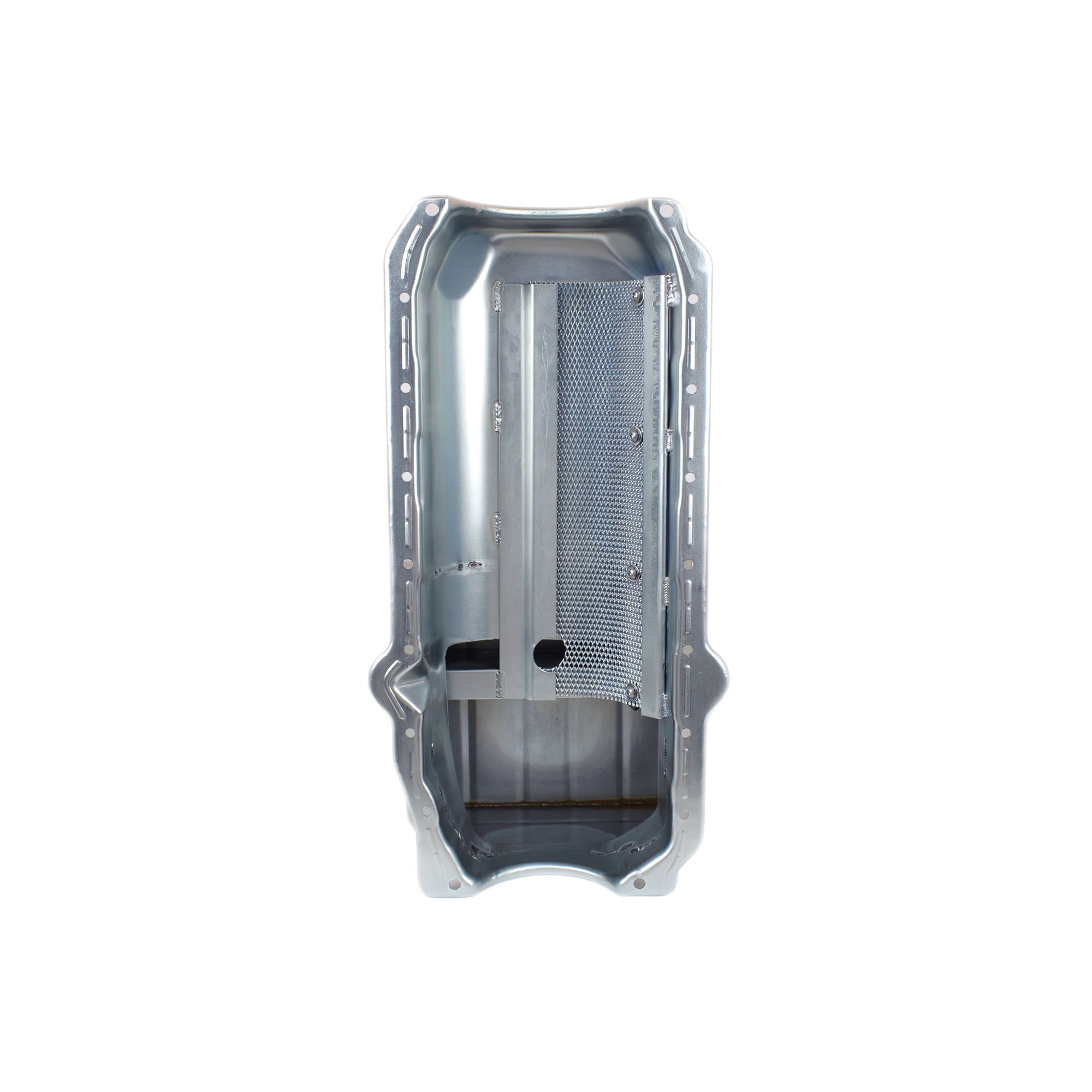 This Small Block Chevy "T" sump drag race oil pan is for pre-?80 blocks with a left side dipstick. It has a 7-1/2" deep, 9-1/2" long by 10-1/2" wide sump and an 7 qt system capacity. This pan requires a short oil filter, and one of our pickups. Will work with stock or aftermarket starters.