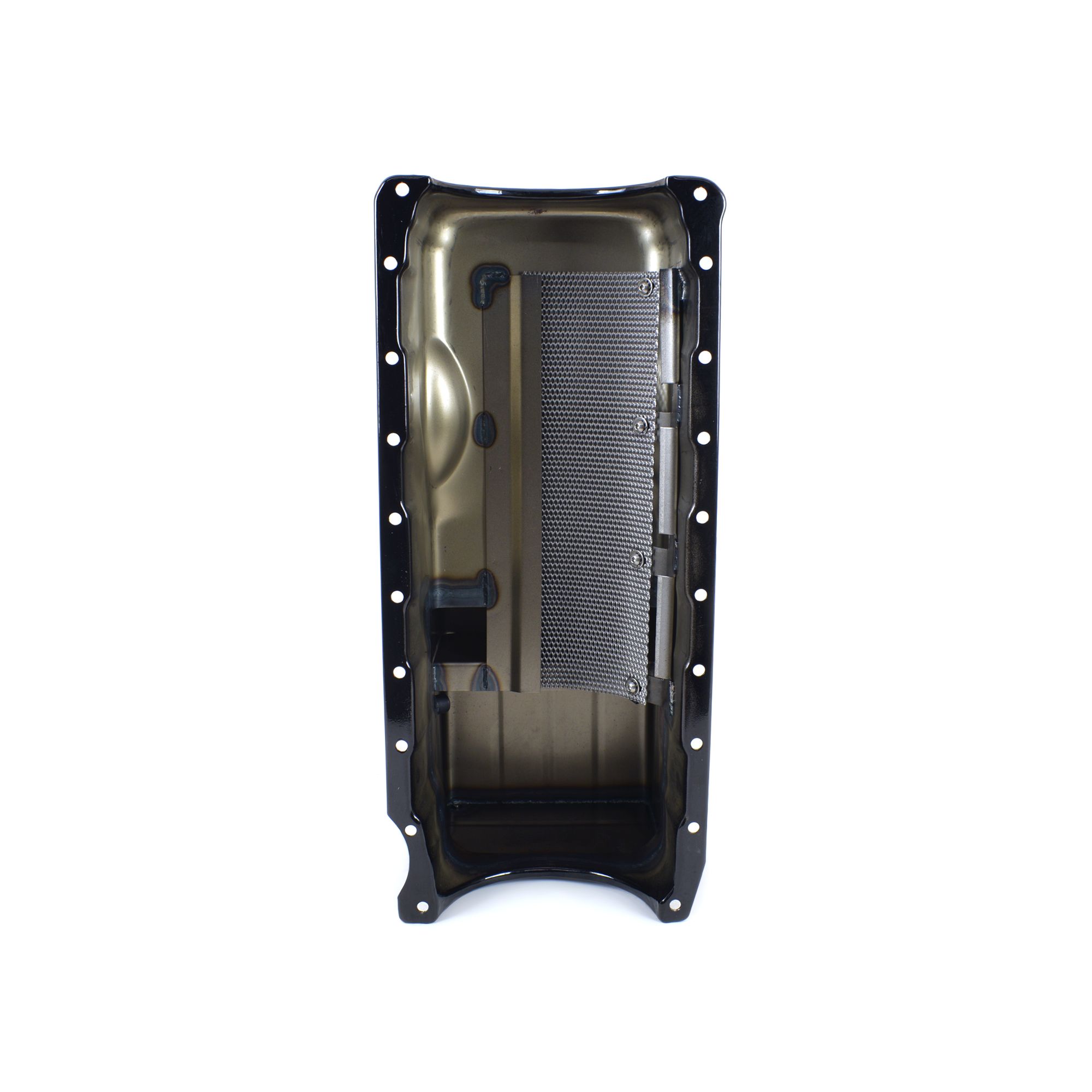 This black powder coat BBC bracket drag oil pan is for Mark 5 / Gen. 6 blocks. It has a 9" deep by 9-1/2" long sump and a 7 qt. system capacity. Takes up to a 4.25 stroke with a steel rod. This pan requires our 20-190 pickup. Will work with stock or aftermarket starters.