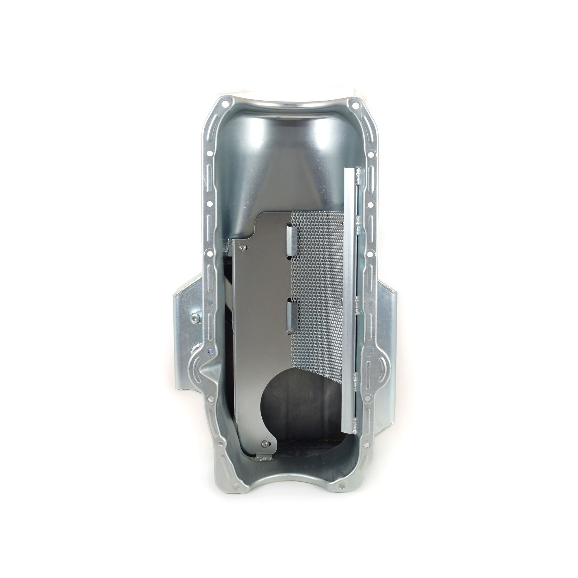 This SBC road race pan is for pre-?80 blocks with left side dipstick. It is designed as a general purpose road race oil pan to fit in most applications, including front steer chassis with aftermarket or Camaro front ends. It has a 7-1/2" deep, 13-3/4" wide, 12" long sump with an 8 quart system capacity. This pan requires one of our pickups.