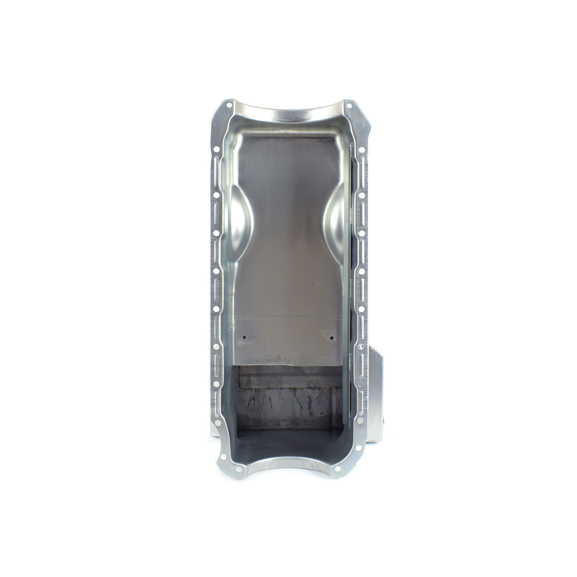 This BBC early Chevelle pan is for standard Mark 4 Big Blocks with a 2 piece rear seal. It is designed with angled front corners to fit in '64-'67 Chevelle and most other GM chassis. It has a 9" deep, 13" wide, 8-1/2" long sump for an 8 quart system capacity. This pan requires our 20-190 pickup.
