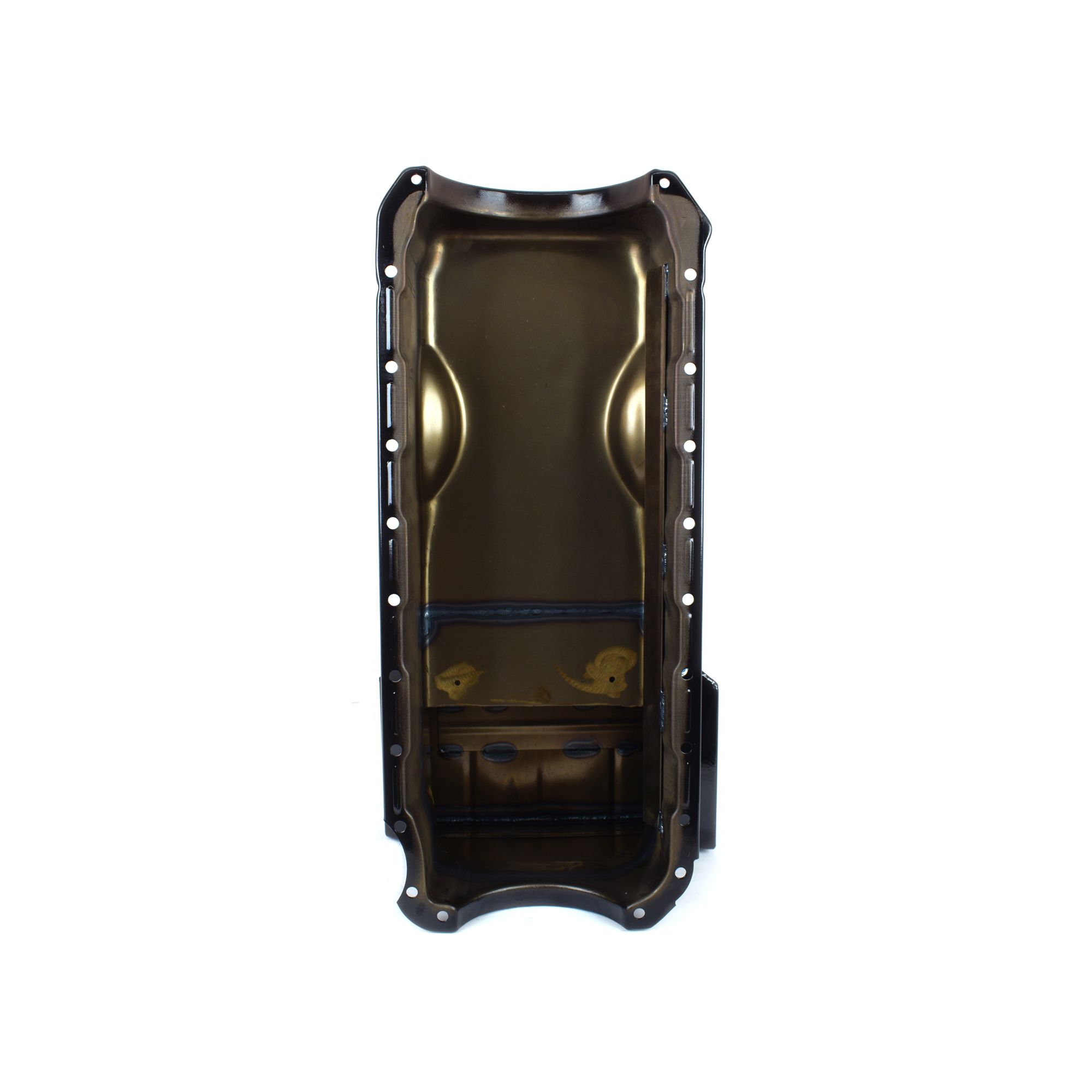 This black powdercoat BBC early Chevelle pan is for standard Mark 4 Big Blocks with a 2 piece rear seal. It is designed with angled front corners to fit in '64-'67 Chevelle and most other GM chassis. It has a 9" deep, 13" wide, 8-1/2" long sump for an 8 quart system capacity. This pan requires our 20-190 pickup.