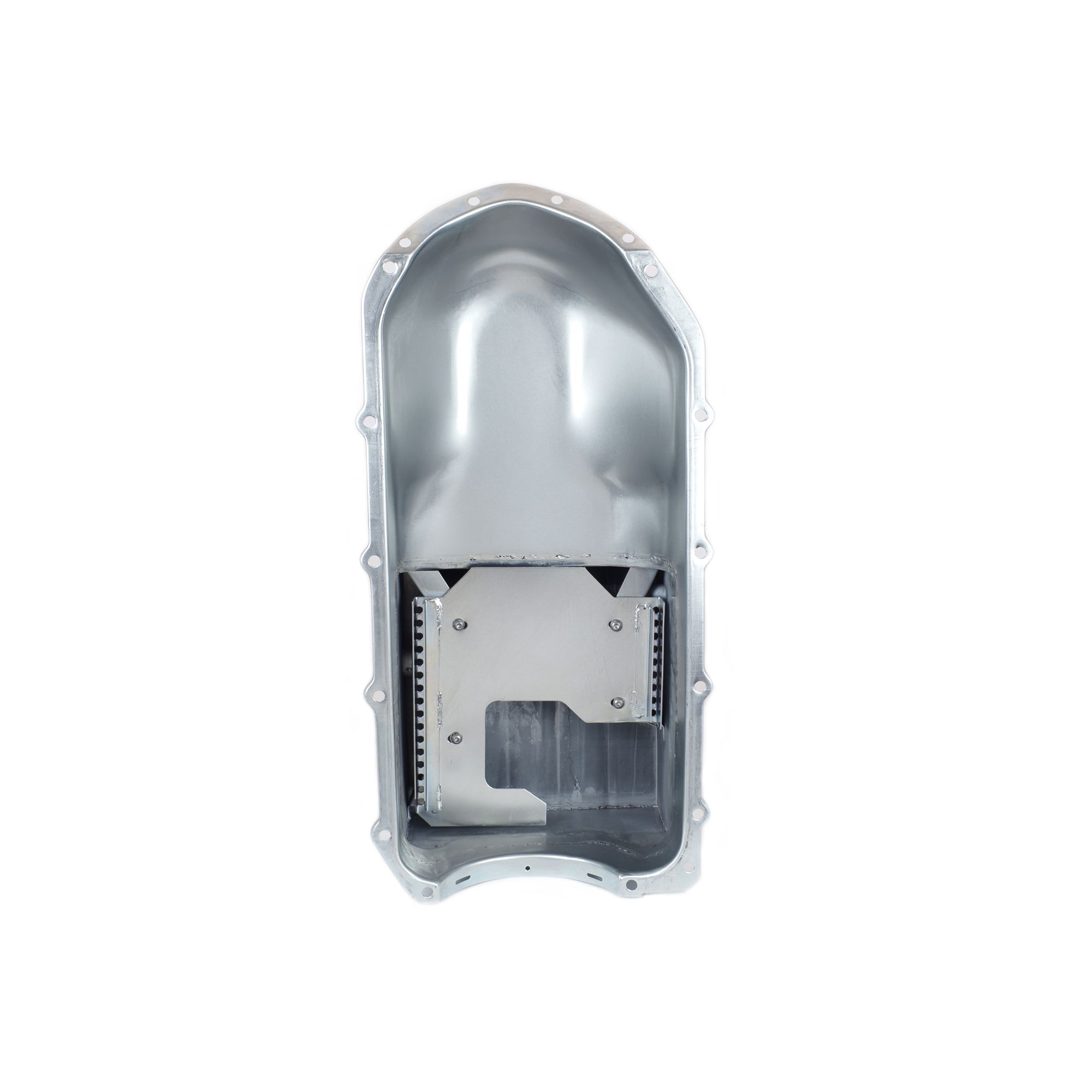 This shallow pan for Pontiac 301-455 engines and fits all popular chassis except G.T.O.s and '67-'69 Firebirds. It has a 7" deep, 10-1/2" long sump for a 6 quart system capacity. Cannot be used with some stock exhaust systems (measure for clearance). This pan requires our 15-451 pickup.