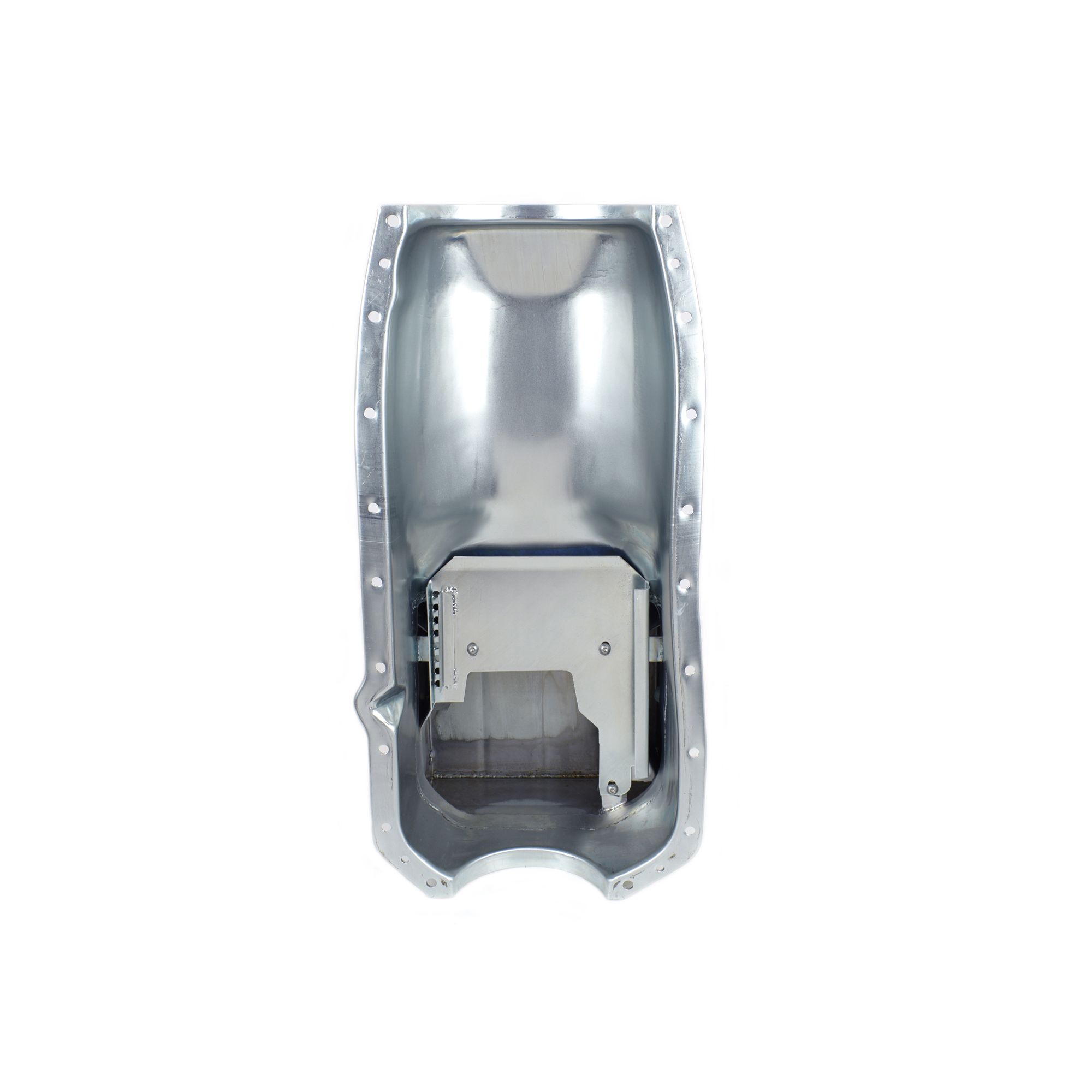 This Oldsmobile 307-455 oil pan is designed for performance street, drag race, or road race applications. It has an 8-1/4" deep by 8" long sump for a 6 quart system capacity. This pan requires our 15-503 pickup.